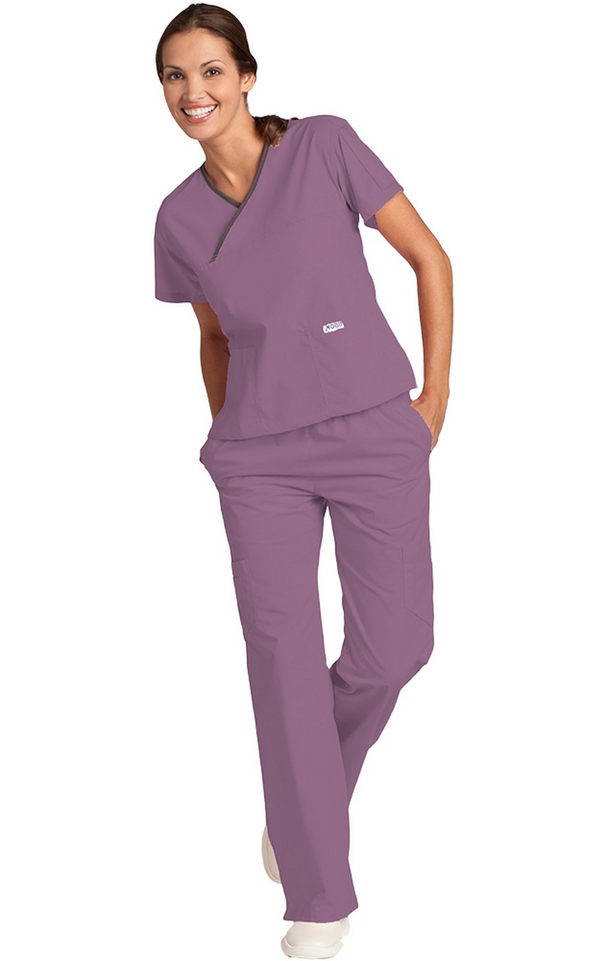 Crossover to MOBB!. The bestselling crossover scrub set in Canada is the MOBB Criss Cross Flip Flap scrub set. THE TOP: Features a V-neck with a contrast color trim as well as two lower pockets and one shoulder pen pocket. THE PANT: Fabulous fit and classic style. This five-pocket boot cut pant features our signature MOBB logo waistband that can be flipped down for a lower rise. Fabric is 65/35 Poly/Cotton.