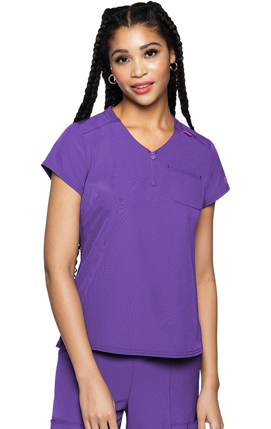 Simple, but far from average. The Quarter Zip V-Neck Tuckable Top offers a functional quarter zipper and rib-knit back neckband. It features forward shoulder seams with cap sleeves and a single chest pocket for storage. With a rounded high-low hem, this top can be worn comfortably tucked or untucked. There's also a convenient bungee ID badge loop on the wearer's left shoulder and locker loop on the center upper back.