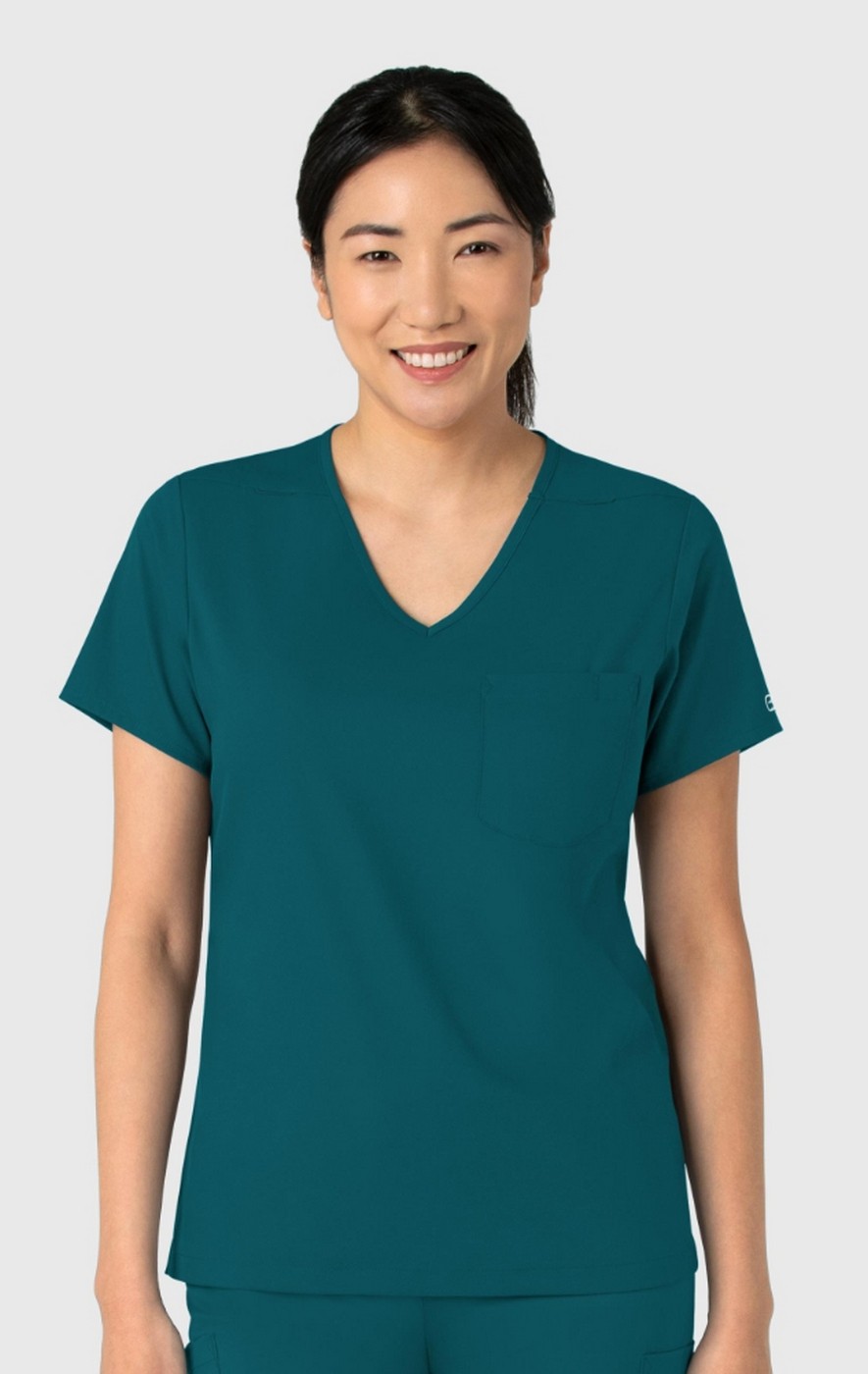 A softly curved V-neck and a high-to-low hem give this women's tuck-in scrub top a flattering fit that's modern and fresh. Pockets make sure practicality stays a priority, including a chest pocket that has a bartack stitch for your pen, plus a back card pocket that zips shut to keep small items close and secure. A loop on both shoulders provides a place for your badge on whichever side you find more convenient. The modern fit strikes the perfect balance of letting you move freely without feeling like it's baggy or loose. Side hem vents open up the profile so you get full range of motion as you make your way through a shift. Tuck this scrub top into your favorite scrub pants or let it hang loose with its tailored drape. Built from a super soft and stretchy material, it's sustainably made — so while you're caring for your patients, you can know you're also doing your part to help protect the planet.