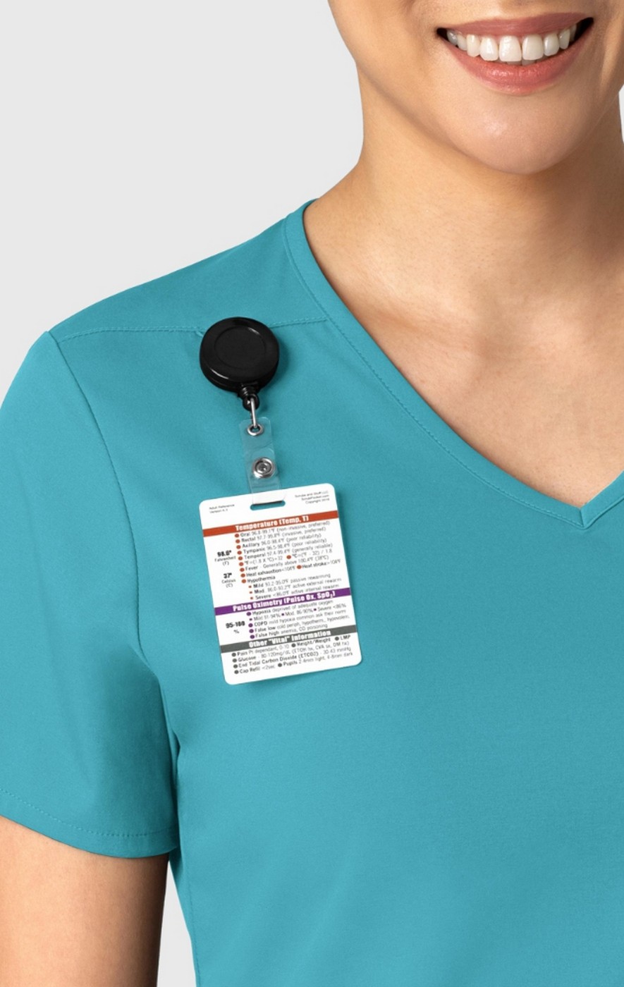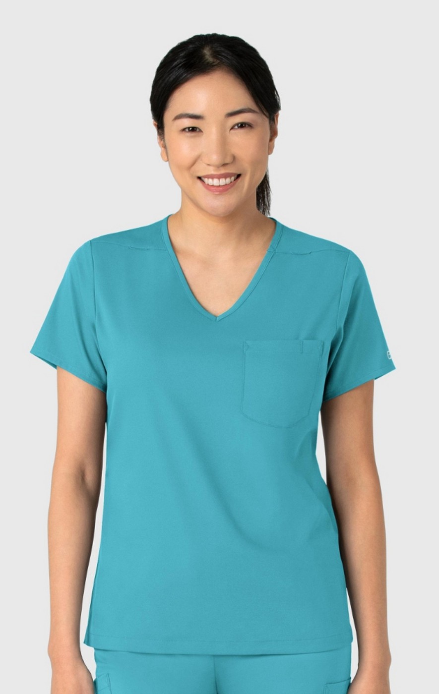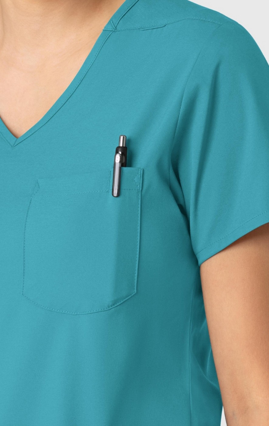 A softly curved V-neck and a high-to-low hem give this women's tuck-in scrub top a flattering fit that's modern and fresh. Pockets make sure practicality stays a priority, including a chest pocket that has a bartack stitch for your pen, plus a back card pocket that zips shut to keep small items close and secure. A loop on both shoulders provides a place for your badge on whichever side you find more convenient. The modern fit strikes the perfect balance of letting you move freely without feeling like it's baggy or loose. Side hem vents open up the profile so you get full range of motion as you make your way through a shift. Tuck this scrub top into your favorite scrub pants or let it hang loose with its tailored drape. Built from a super soft and stretchy material, it's sustainably made — so while you're caring for your patients, you can know you're also doing your part to help protect the planet.
