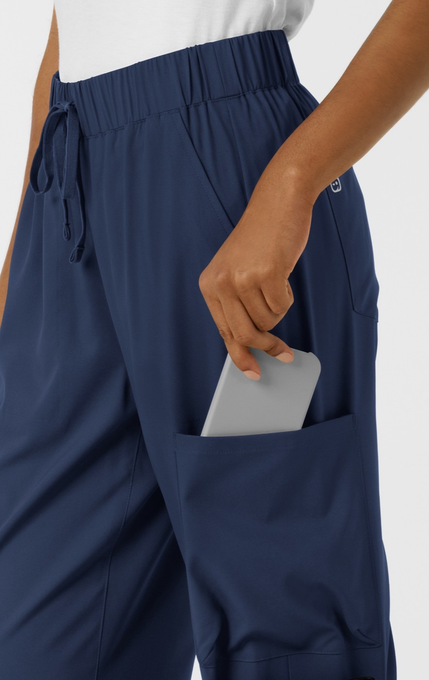 All the utility your job requires, in a stylish package. These women's scrub pants bring a fashionable sensibility to your look at work. Designed with a wide leg opening, they deliver the modern, on-trend silhouette you love when you're off duty. Four cargo pockets ensure you've got plenty of space to bring scissors, a thermometer, a stethoscope and even a snack with you as you move through your shift. Slant pockets in front and additional pockets in the back offer room for other tools and essentials like your phone or wallet. An adjustable drawstring on the elastic waist allows you to personalize the fit with every wear. These scrub pants are made of soft, stretchy material that feels good against your skin and lets you to move freely. Plus the material is sustainably made for planet-friendly style.