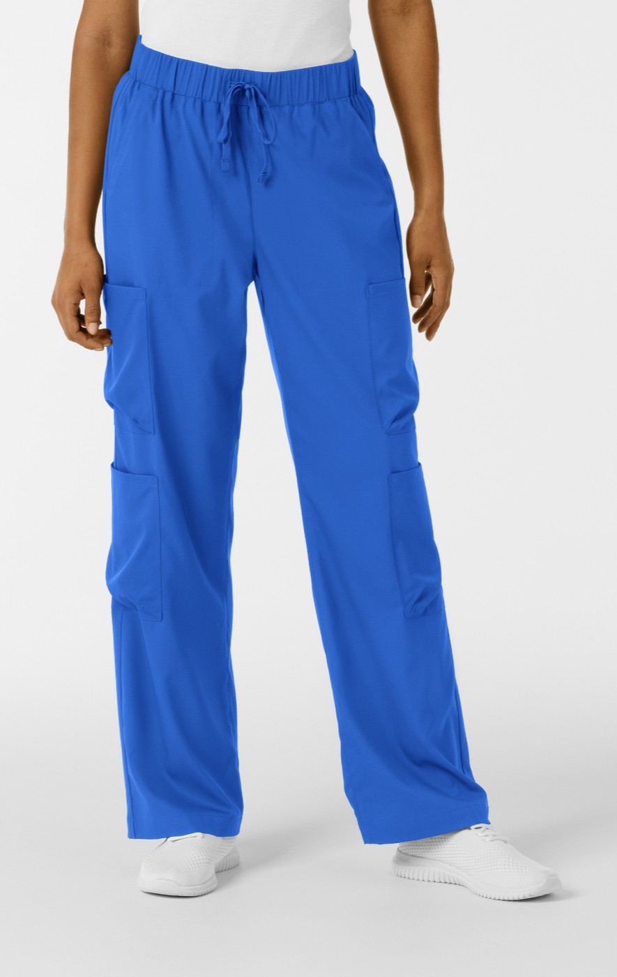 All the utility your job requires, in a stylish package. These women's scrub pants bring a fashionable sensibility to your look at work. Designed with a wide leg opening, they deliver the modern, on-trend silhouette you love when you're off duty. Four cargo pockets ensure you've got plenty of space to bring scissors, a thermometer, a stethoscope and even a snack with you as you move through your shift. Slant pockets in front and additional pockets in the back offer room for other tools and essentials like your phone or wallet. An adjustable drawstring on the elastic waist allows you to personalize the fit with every wear. These scrub pants are made of soft, stretchy material that feels good against your skin and lets you to move freely. Plus the material is sustainably made for planet-friendly style.