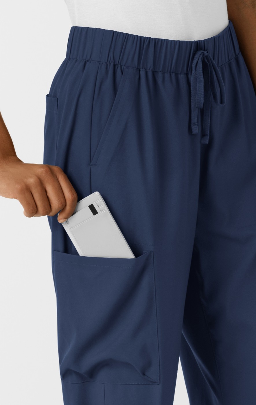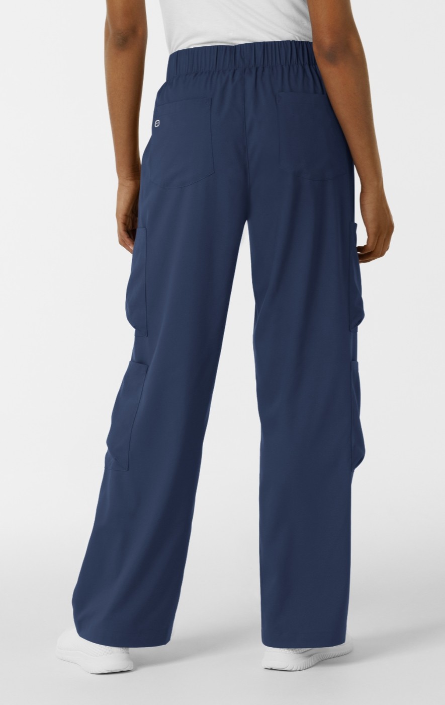 All the utility your job requires, in a stylish package. These women's scrub pants bring a fashionable sensibility to your look at work. Designed with a wide leg opening, they deliver the modern, on-trend silhouette you love when you're off duty. Four cargo pockets ensure you've got plenty of space to bring scissors, a thermometer, a stethoscope and even a snack with you as you move through your shift. Slant pockets in front and additional pockets in the back offer room for other tools and essentials like your phone or wallet. An adjustable drawstring on the elastic waist allows you to personalize the fit with every wear. These scrub pants are made of soft, stretchy material that feels good against your skin and lets you to move freely. Plus the material is sustainably made for planet-friendly style.