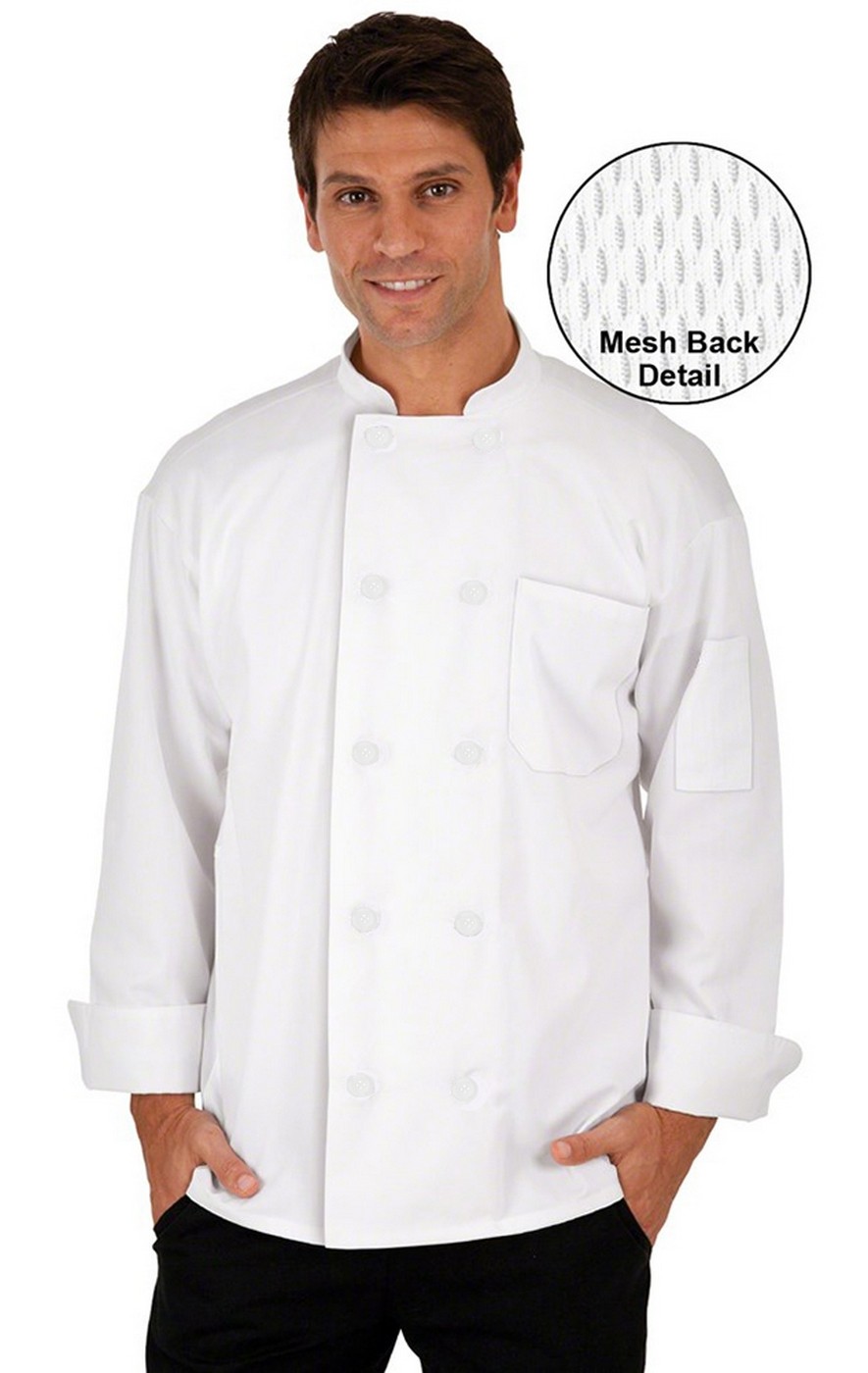 Moisture wicking mesh back chef coat. This chef coat is constructed with premium fabrics and features a breast pocket, thermometer pocket and finished cuffs and collar. It also has 10 buttons in the front and a mesh back to keep you cool all day long. Fabric is 65/35 poly/cotton twill.