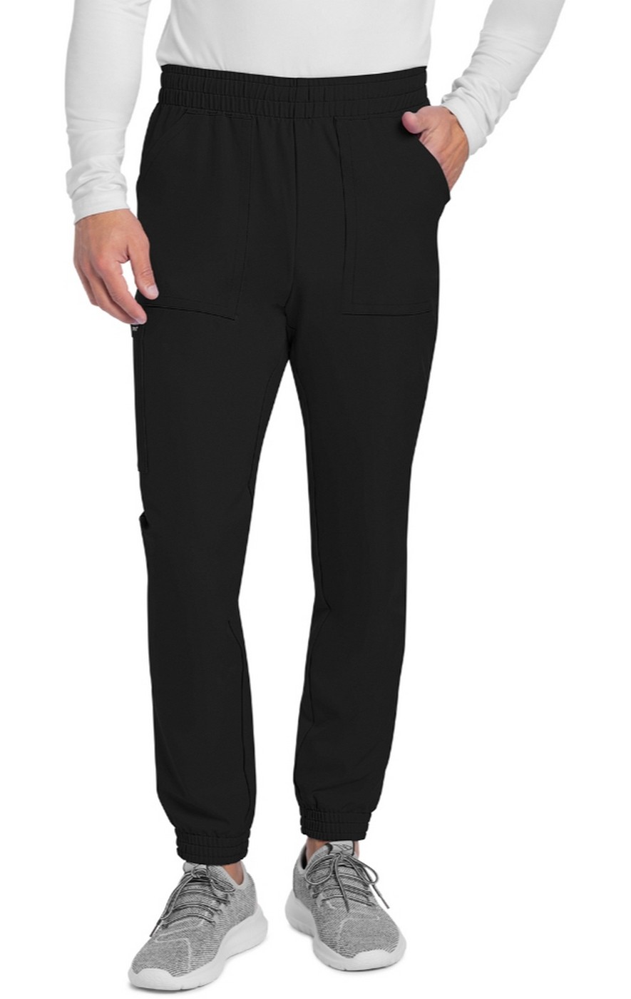 This Men's fit jogger offers style and function. The mid rise pull-on elasticized waistband has an interior drawstring for adjustability. There are a total of four pockets: two front pockets with slanted entry, one cargo pocket with pen/instrument slot on the wearer's right side, and one back patch pocket. The cargo pocket and back pocket have reverse hem trim for added detailing. This Men's scrub jogger is finished with elasticized cuffs and decorative tonal topstitching. Tapered jogger leg.