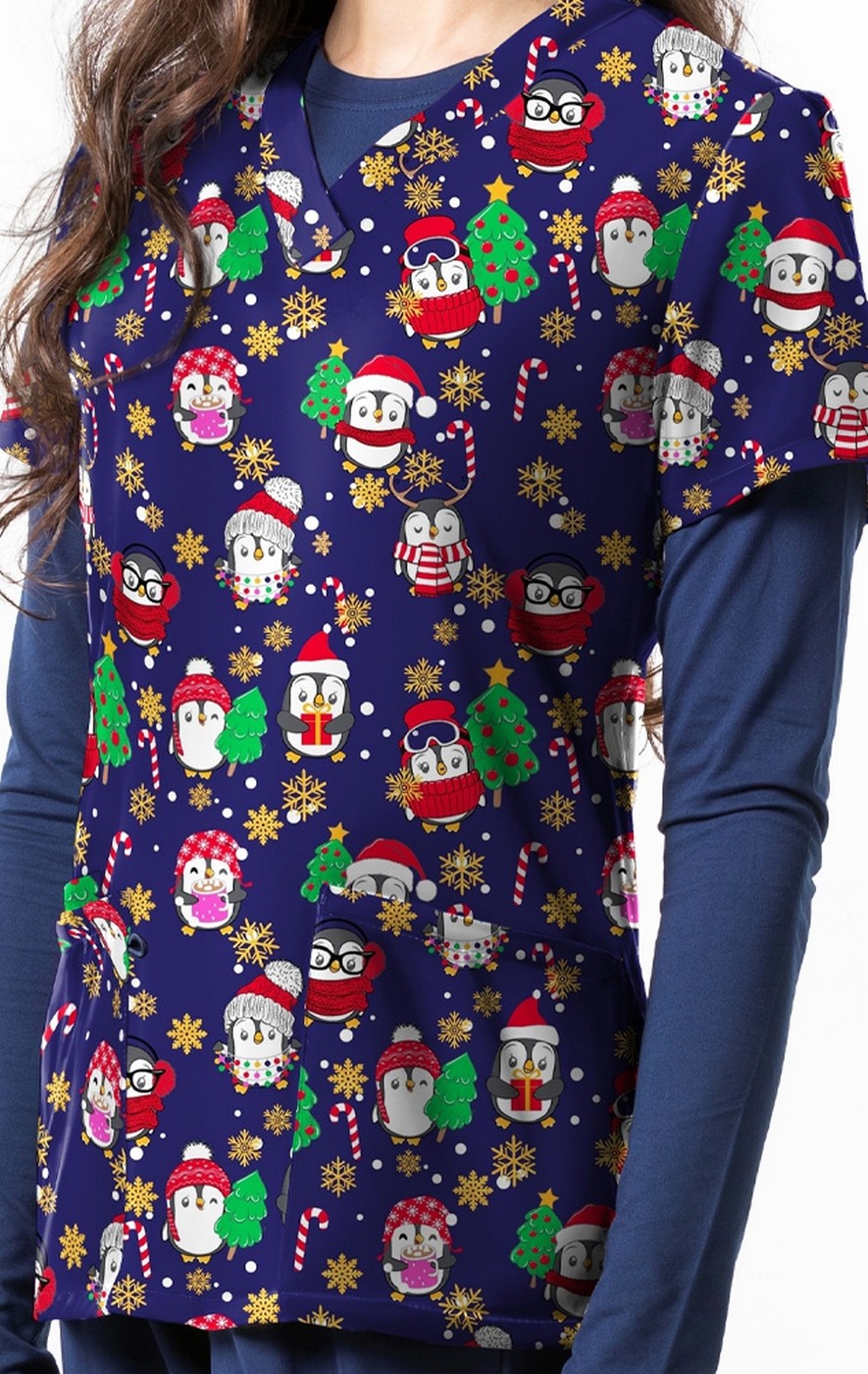 *FINAL SALE 1571NV – Penguin Snow Day Print Scrub Top by Greentown