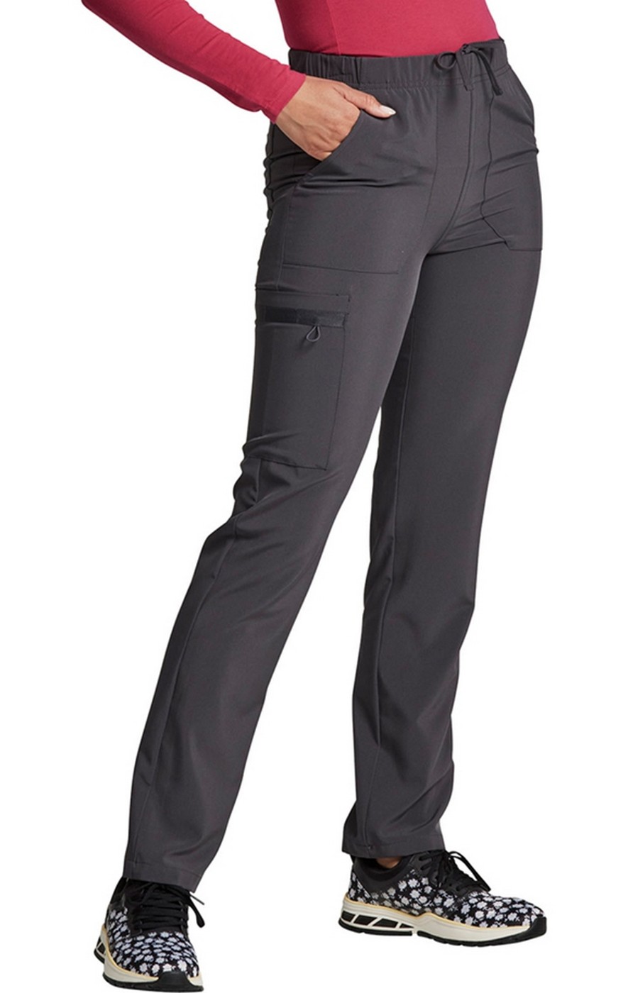 This unisex fit pant has an interior elastic waistband with an inside drawstring. There are five pockets: two front pockets, one cargo pocket with twill tape utility loops plus a bungee badge ID loop, and two back patch pockets.