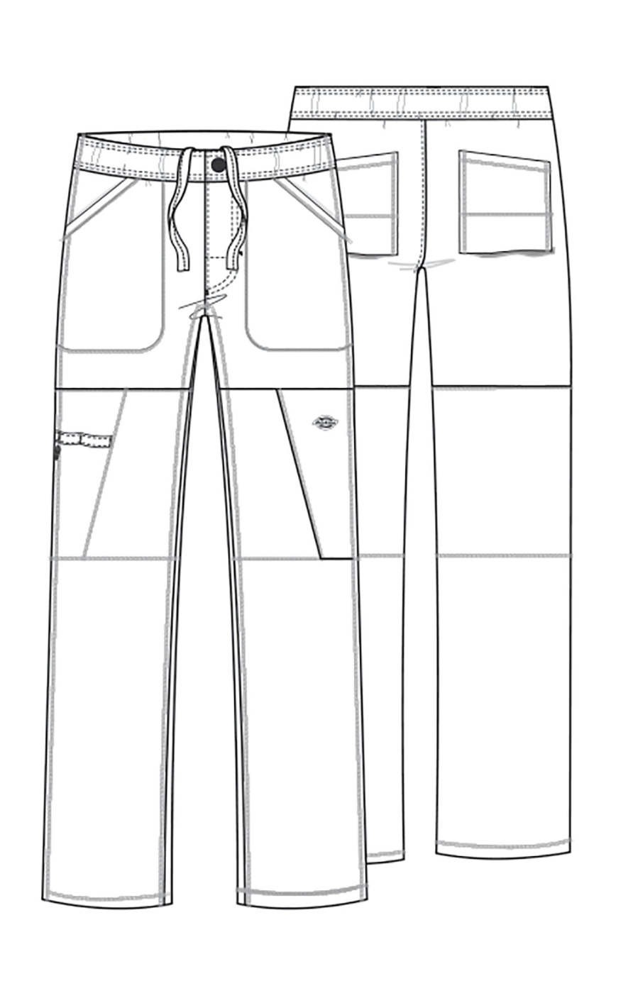This straight leg pant featuring a functional drawstring, zip fly with front button closure and a hidden inseam gusset for an easy fit. Also features front angled pockets, patch back pockets, cargo pockets (the right with zip closure and instrument loops, the left with a tonal logo) and coverstitch detail throughout.
