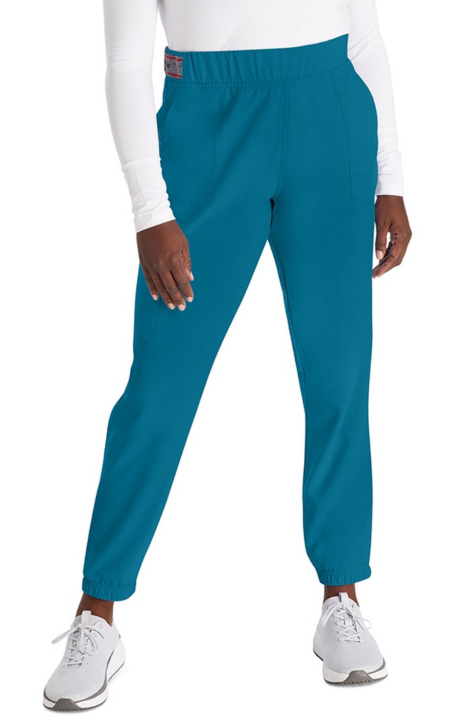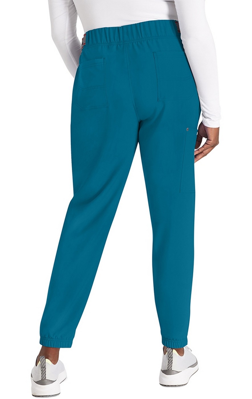 Logo and stitching details upgrade this work-to-weekend Contemporary fit mid rise jogger. The elastic-reinforced pull-on waistband includes an inside drawstring. Logo elastic on the sides of the waistband adds style and comfort. There are five pockets for easy storage: two front pockets, one cargo pocket with decorative logo snaps at the corners, and two back pockets with decorative stitching. Decorative topstitching on all seams plus elasticized cuffs completes the look.