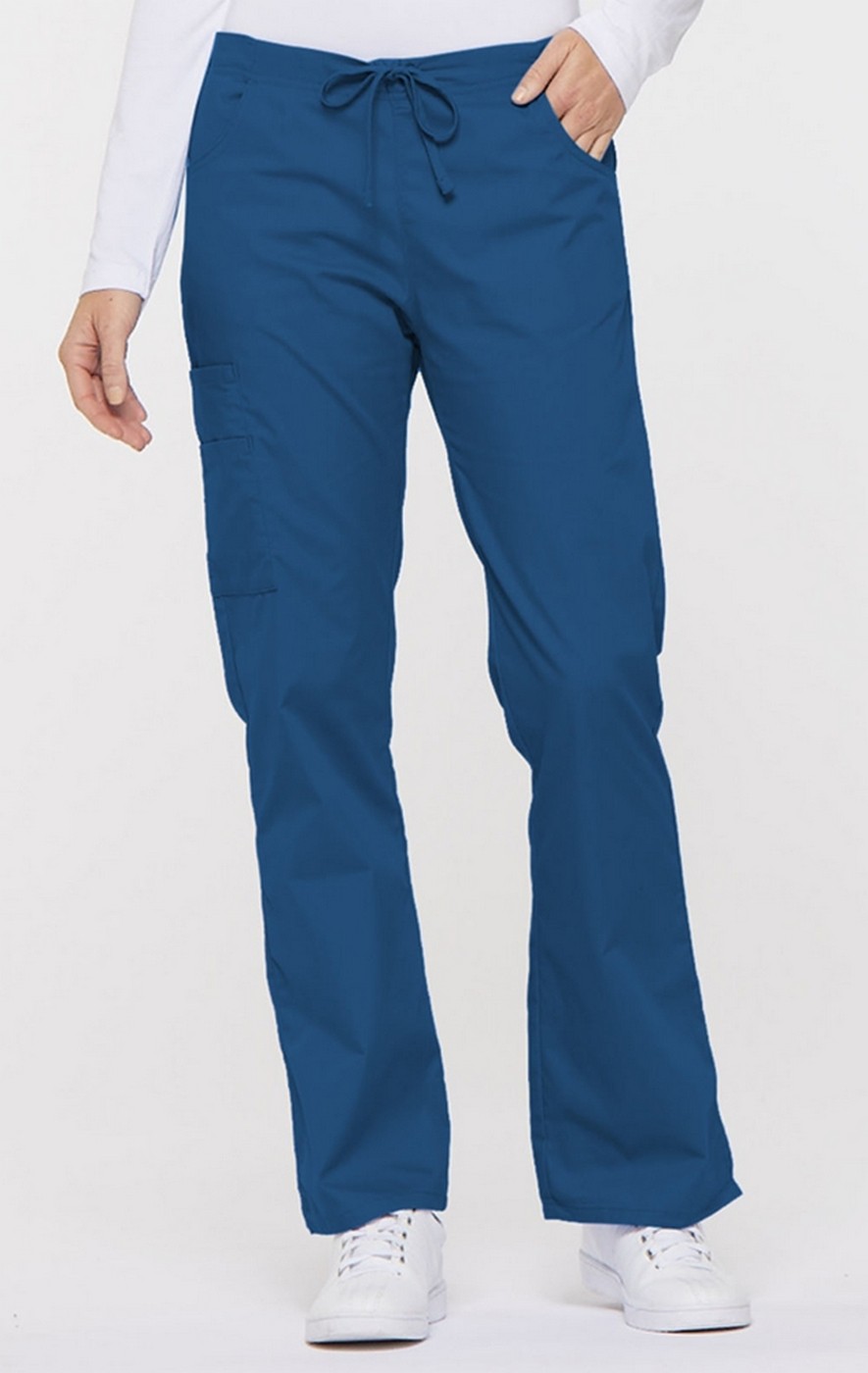 A modern classic fit, mid rise, moderate flare leg pant features an adjustable drawstring with elastic at the back waist and Dickies logo twill tape on the inside back waistband. Also featured are front scoop pockets, a back pocket, cargo pockets with a stretch Red knit interior pocket (White knit pocket on White) and side vents.