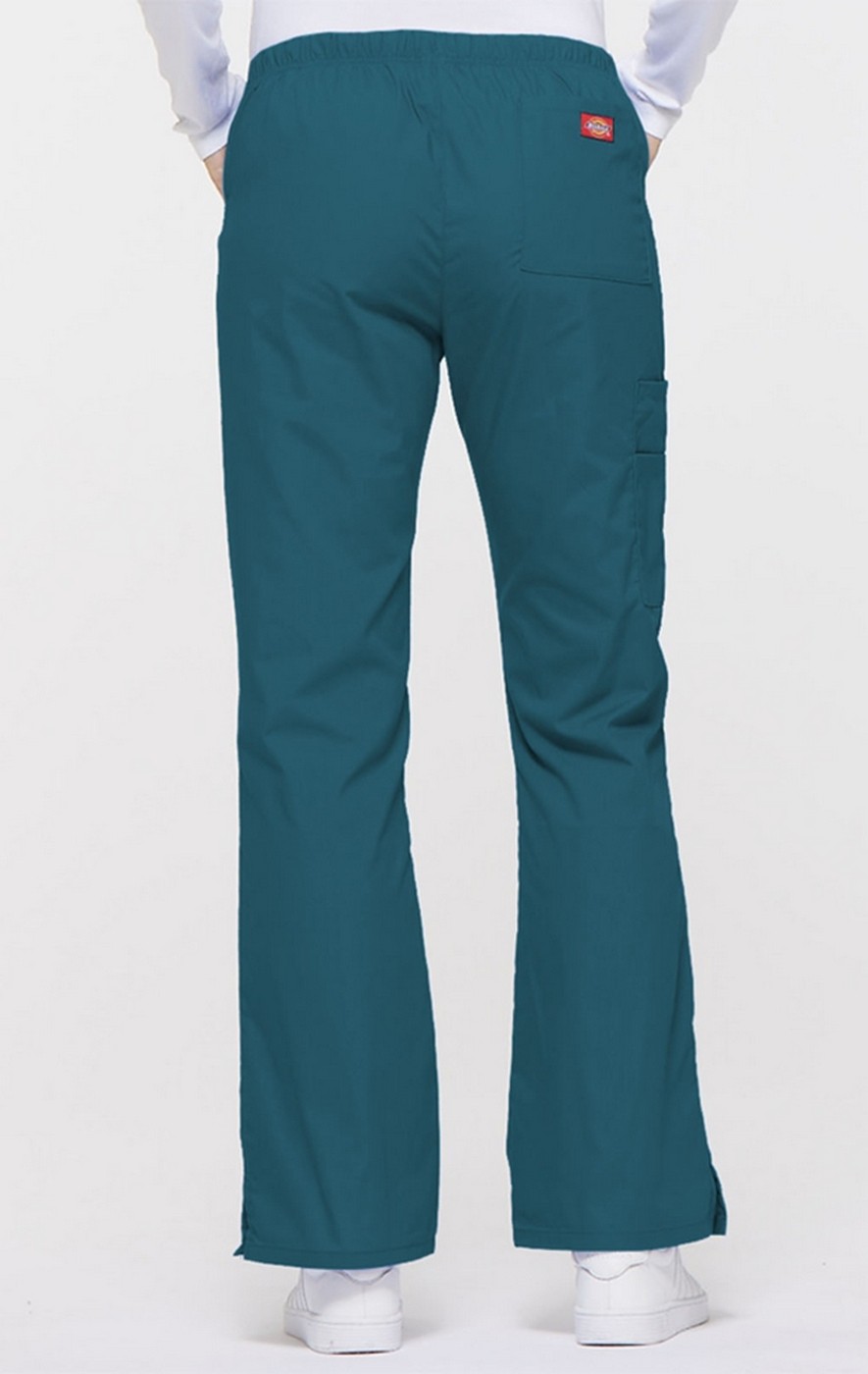 A modern classic fit, mid rise, moderate flare leg pant features an adjustable drawstring with elastic at the back waist and Dickies logo twill tape on the inside back waistband. Also featured are front scoop pockets, a back pocket, cargo pockets with a stretch Red knit interior pocket (White knit pocket on White) and side vents.