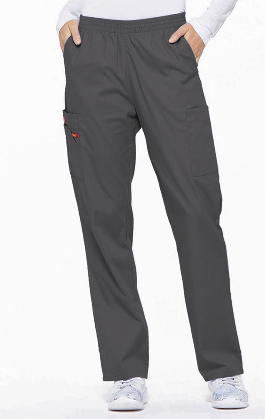 A modern classic fit, natural rise, tapered leg, pull-on pant features an all around elastic waistband with a Dickies logo twill tape on the inside back waistband and has an instrument loop on the right cargo pocket. Also featured are front angled pockets and cargo pockets with a stretch Red knit interior pocket (White knit pocket on White).