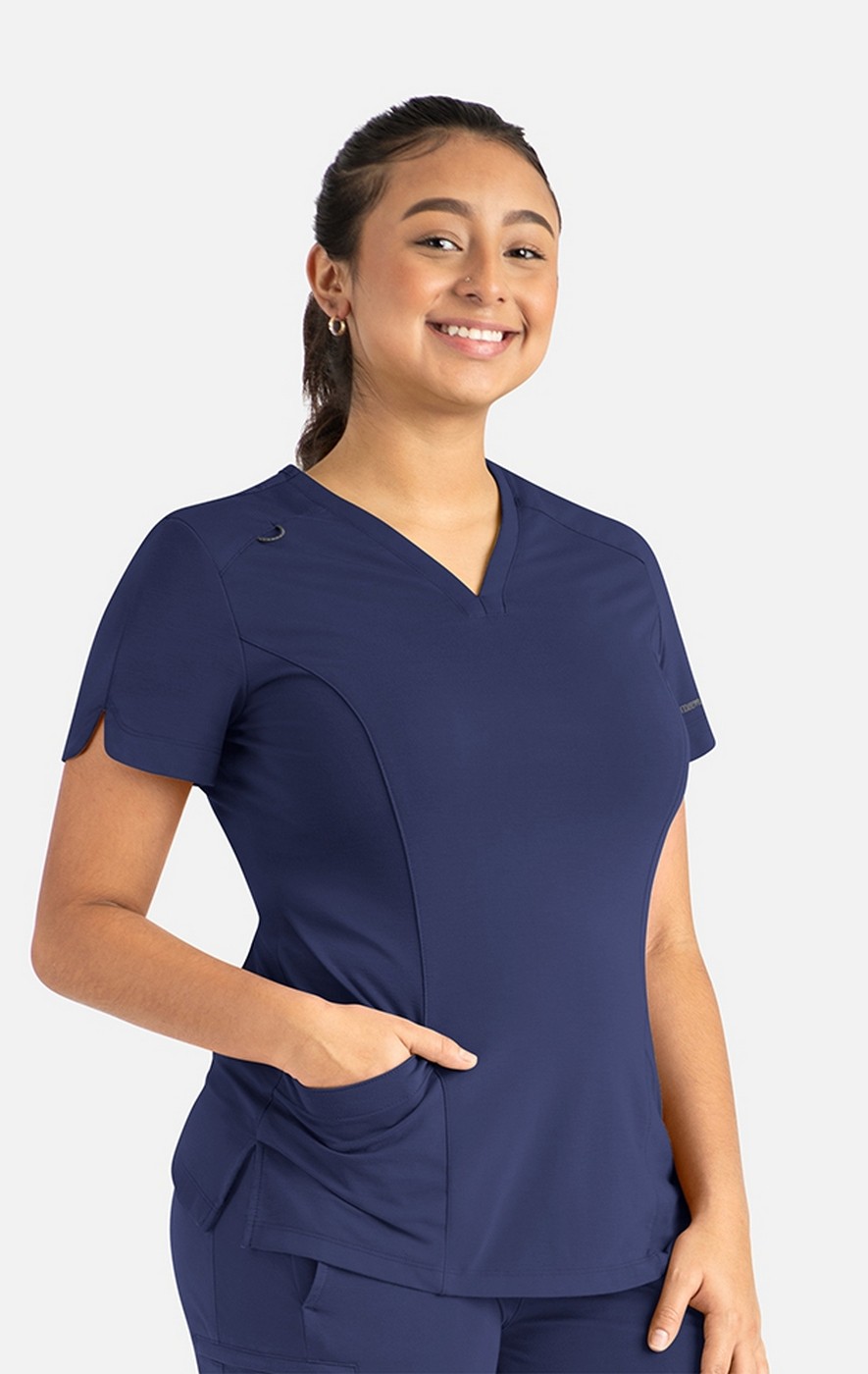 20302 Focus V-Neck Petal Back Hemline Top by Maevn