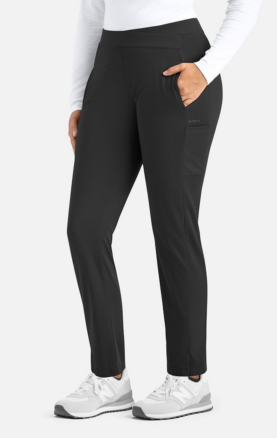-Slightly tapered leg with side slits at ankles for comfort and mobility