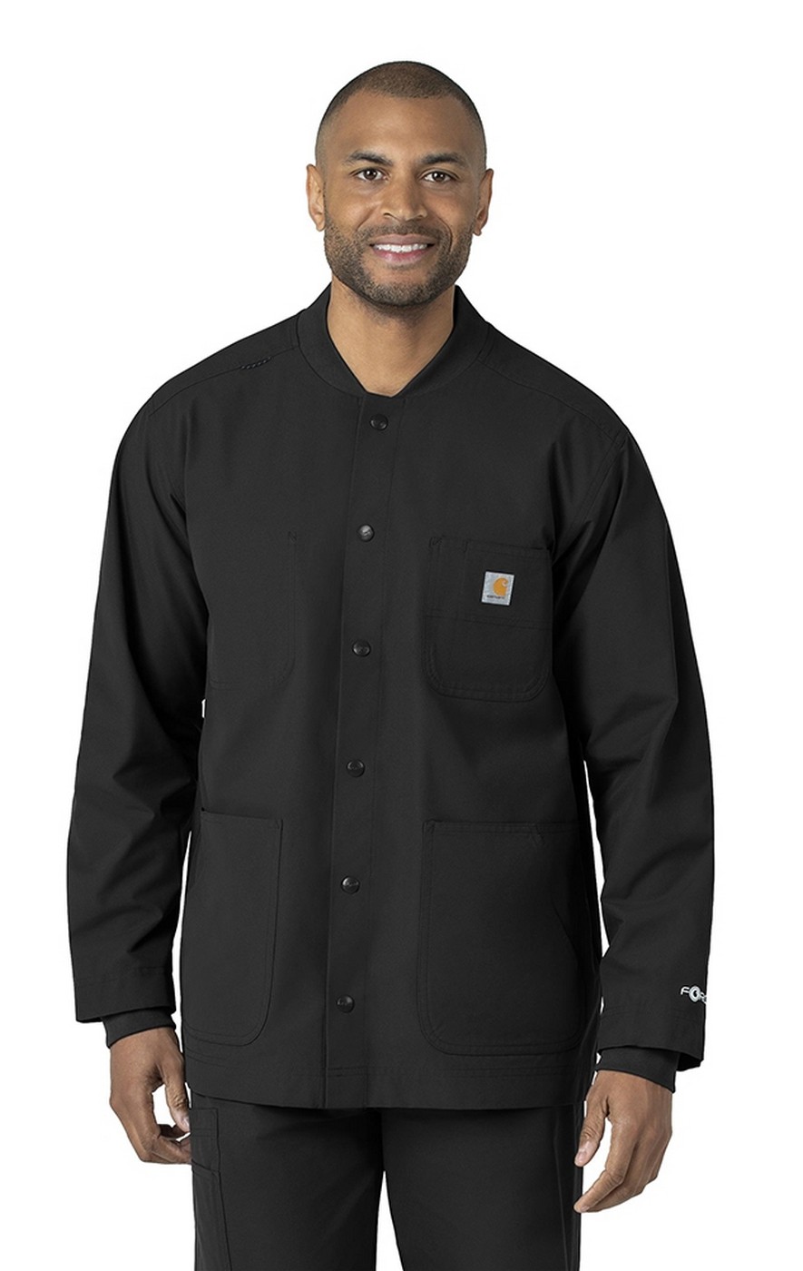 Stay comfortable as you check off every item on your workday to-do list in this Carhartt chore coat. Part of the Force Essentials collection, it's designed with technologies that help you to perform at your very best on the job. It's made of lightweight, durable fabric and cut for a modern fit that's not too tight and not too loose. Rugged Flex® stretch technology offers built-in stretch that allows you to reach the top shelf of the supply cabinet or help turn patients. Sweat-wicking and quick-drying, the coat helps you feel fresh from the beginning of your shift to the end. Stain-resistant technology keeps it looking good for seasons to come. A snap-button closure gives it a polished, professional look. Multiple functional pockets include a chest pocket with a pen slot, two top-load pockets, side entry pockets, an accessory loop inside the left pocket, and one interior full size top pocket.