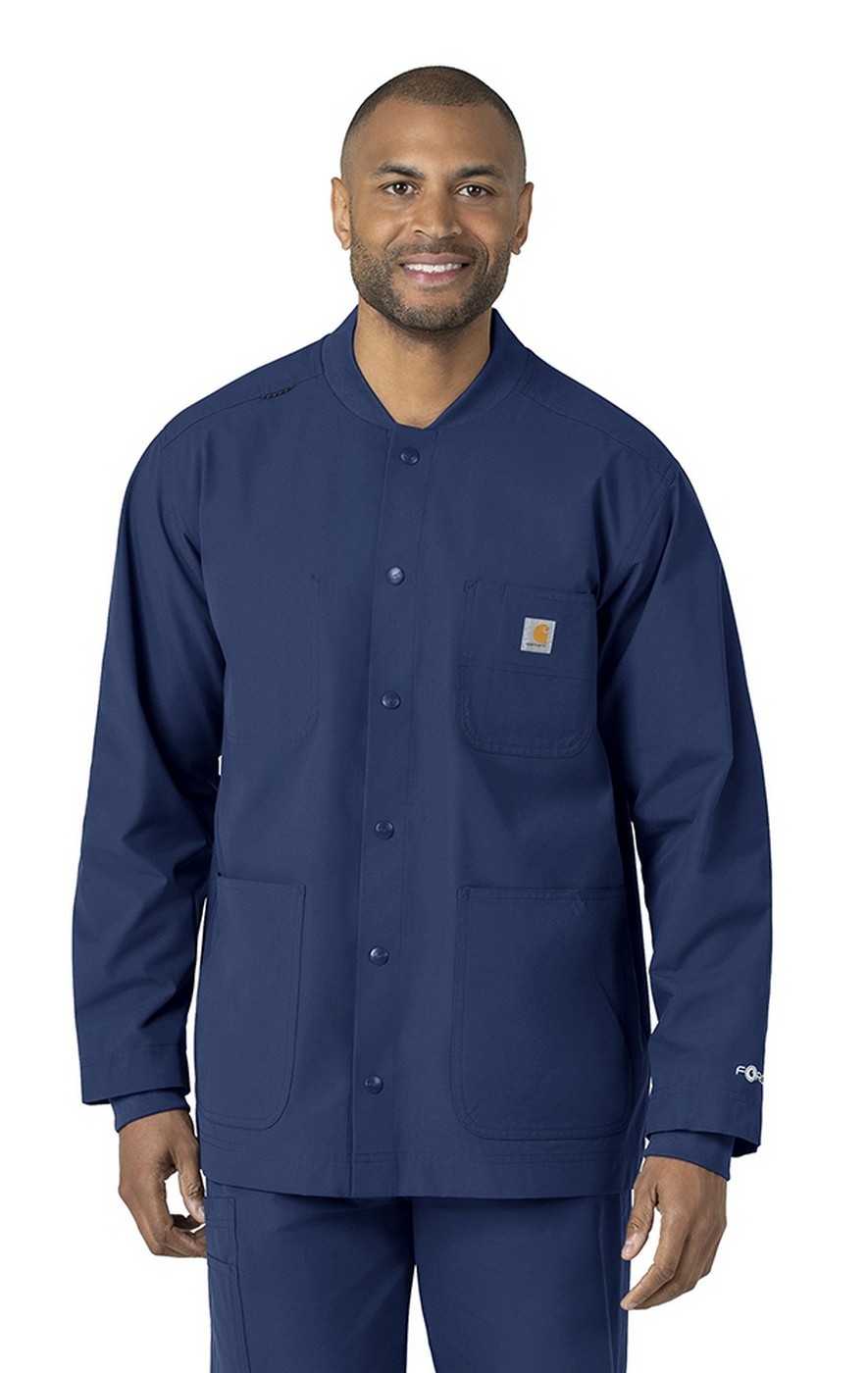 Stay comfortable as you check off every item on your workday to-do list in this Carhartt chore coat. Part of the Force Essentials collection, it's designed with technologies that help you to perform at your very best on the job. It's made of lightweight, durable fabric and cut for a modern fit that's not too tight and not too loose. Rugged Flex® stretch technology offers built-in stretch that allows you to reach the top shelf of the supply cabinet or help turn patients. Sweat-wicking and quick-drying, the coat helps you feel fresh from the beginning of your shift to the end. Stain-resistant technology keeps it looking good for seasons to come. A snap-button closure gives it a polished, professional look. Multiple functional pockets include a chest pocket with a pen slot, two top-load pockets, side entry pockets, an accessory loop inside the left pocket, and one interior full size top pocket.