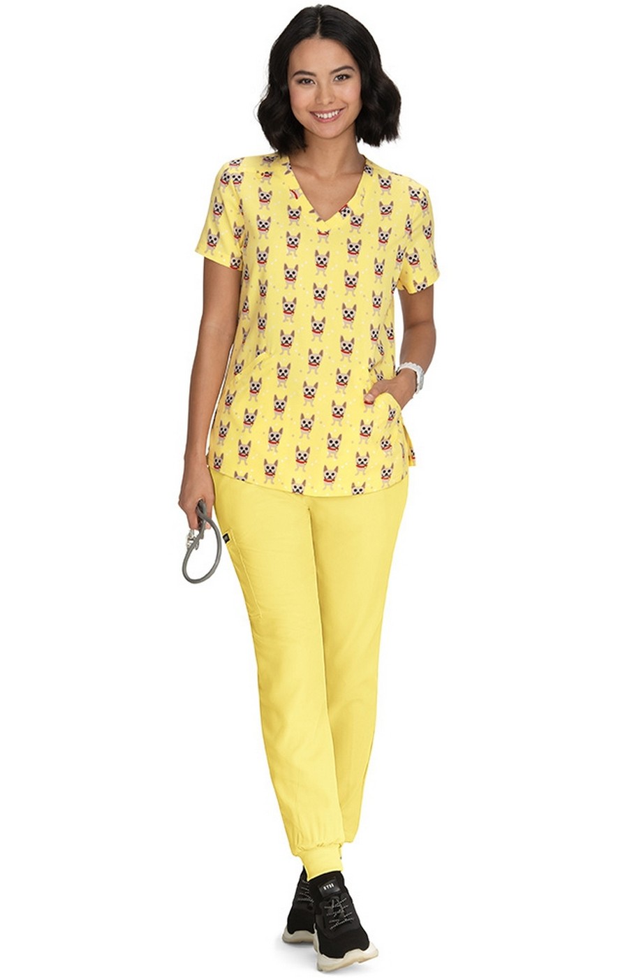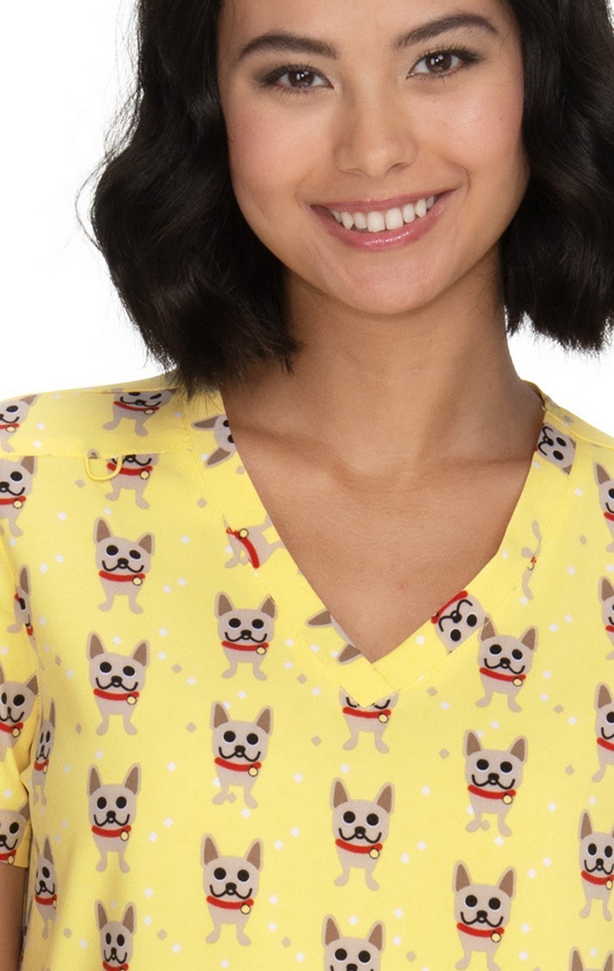 F101PR French Bull by koi Doll V-Neck Print Scrub Top - Frenchie