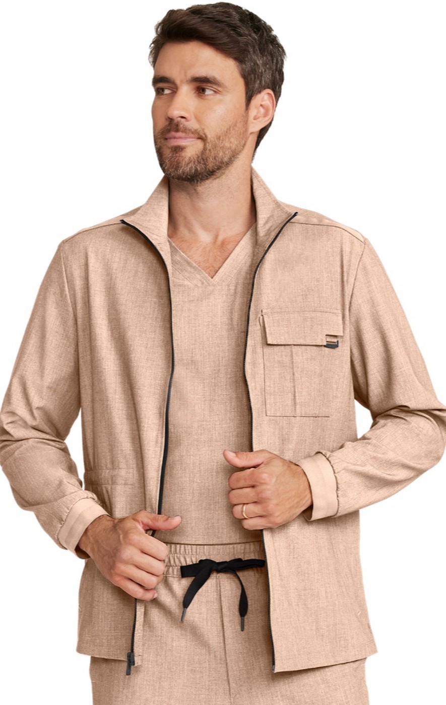 Perfect for work-to-weekend wear, the Austin zip front jacket boasts exceptional design details. There is a logo zipper pull, stand-up collar, grosgrain ribbon trim on the shoulder seams, and patterned elastic sleeve cuffs. This utility jacket is partially lined with knit on the inside front and back yoke to guard against cool days and cold hospitals. There are four pockets for stylish storage: one pintucked chest pocket with flap and logo D-ring, two front welt pockets, and one cell pocket on the inside left. Exterior pockets have printed pocket bags. Adjust the waist using the bungee cord and toggles for a customizable fit. The curved back yoke provides a better fit across the shoulders. Side vents at hem for ease of movement. The soft four-way stretch fabric includes moisture wicking for added comfort.