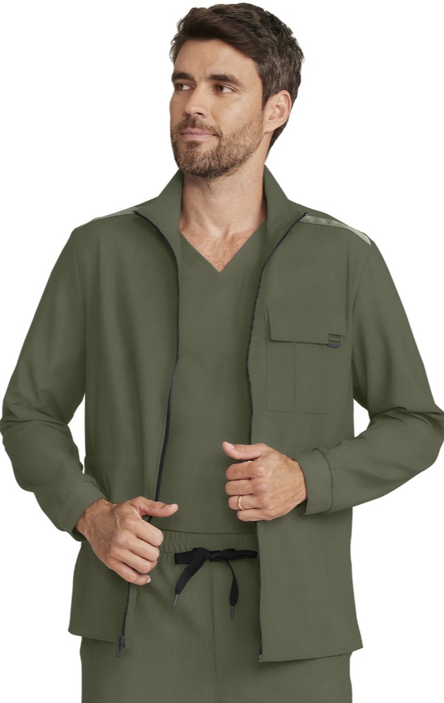Perfect for work-to-weekend wear, the Austin zip front jacket boasts exceptional design details. There is a logo zipper pull, stand-up collar, grosgrain ribbon trim on the shoulder seams, and patterned elastic sleeve cuffs. This utility jacket is partially lined with knit on the inside front and back yoke to guard against cool days and cold hospitals. There are four pockets for stylish storage: one pintucked chest pocket with flap and logo D-ring, two front welt pockets, and one cell pocket on the inside left. Exterior pockets have printed pocket bags. Adjust the waist using the bungee cord and toggles for a customizable fit. The curved back yoke provides a better fit across the shoulders. Side vents at hem for ease of movement. The soft four-way stretch fabric includes moisture wicking for added comfort.