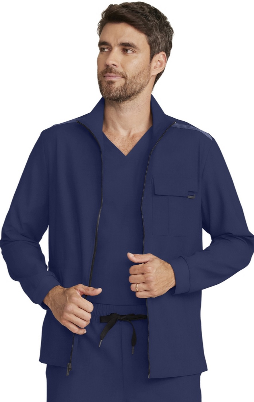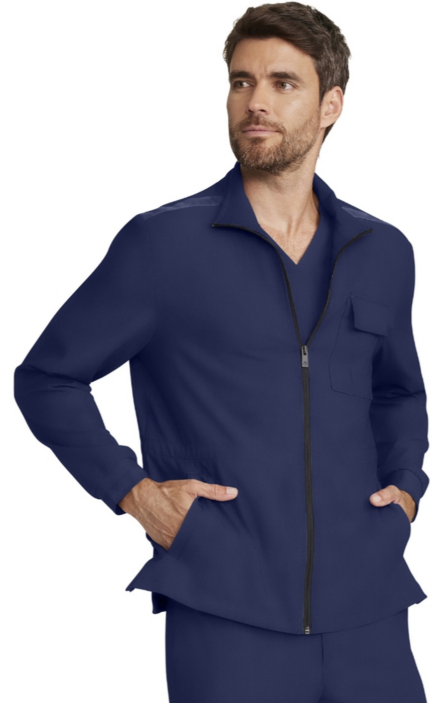 Perfect for work-to-weekend wear, the Austin zip front jacket boasts exceptional design details. There is a logo zipper pull, stand-up collar, grosgrain ribbon trim on the shoulder seams, and patterned elastic sleeve cuffs. This utility jacket is partially lined with knit on the inside front and back yoke to guard against cool days and cold hospitals. There are four pockets for stylish storage: one pintucked chest pocket with flap and logo D-ring, two front welt pockets, and one cell pocket on the inside left. Exterior pockets have printed pocket bags. Adjust the waist using the bungee cord and toggles for a customizable fit. The curved back yoke provides a better fit across the shoulders. Side vents at hem for ease of movement. The soft four-way stretch fabric includes moisture wicking for added comfort.