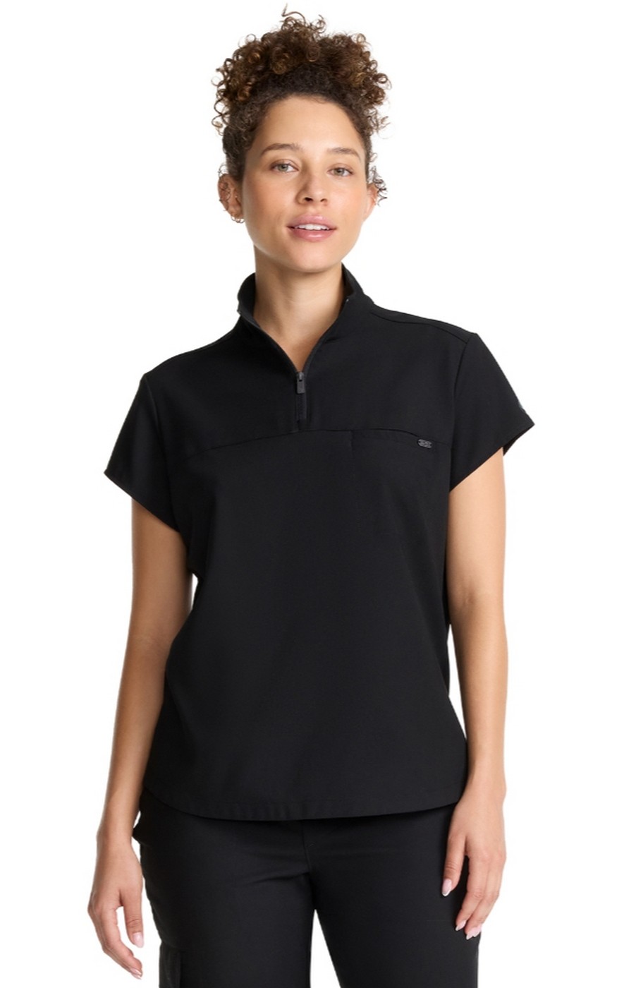 The Bella scrub top has style to spare starting with a stand-up collar and quarter zip opening with logo zipper pull. There is one welt chest pocket with a pretty printed pocket bag plus front chest seam and a curved back yoke. This scrub top is finished with an updated shirttail hem and side vents. The soft four-way stretch fabric includes moisture wicking for added comfort.