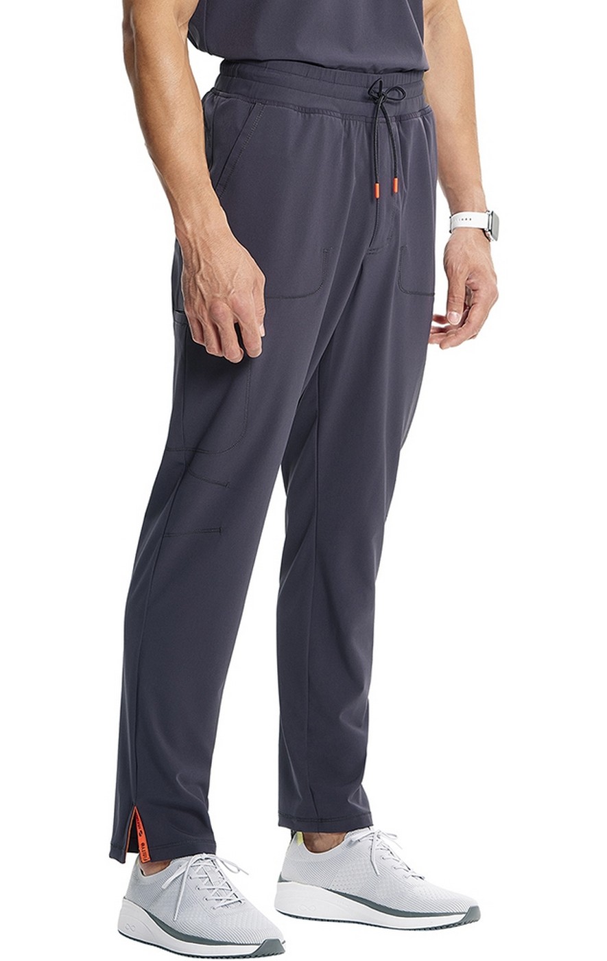 This Men's fit mid rise zip fly pant has a dyed-to-match rib-knit waistband reinforced with inside elastic and finished with a tipped drawstring. There are six pockets: two front pockets with dyed-to-match rib-knit insets at the corners, two welt cargo pockets, and two welt back pockets with signature contrast mesh pocket bags. Other features include knee darts and a curved back yoke seam. Side vents with logo twill tape lining complete this pant.