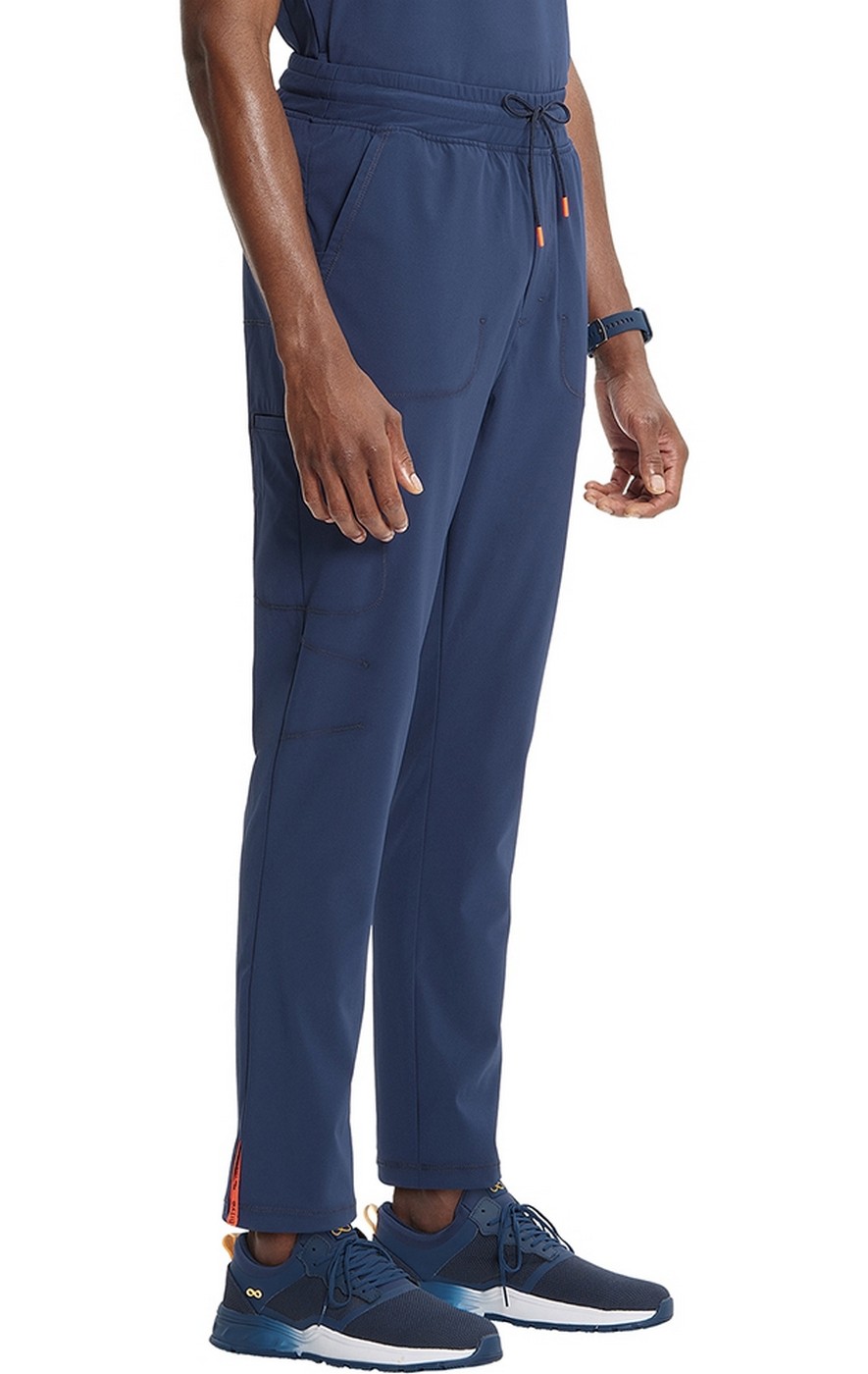 This Men's fit mid rise zip fly pant has a dyed-to-match rib-knit waistband reinforced with inside elastic and finished with a tipped drawstring. There are six pockets: two front pockets with dyed-to-match rib-knit insets at the corners, two welt cargo pockets, and two welt back pockets with signature contrast mesh pocket bags. Other features include knee darts and a curved back yoke seam. Side vents with logo twill tape lining complete this pant.