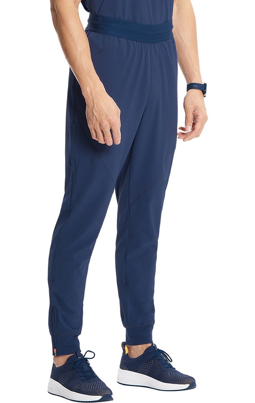 This Men's fit pull-on jogger has a logo elastic waistband with an interior drawstring and a curved back yoke seam. There are four pockets for organized storage: two in-seam side pockets, one zipper cargo pocket with contrast mesh pocket bag on the wearer's right side, and one in-seam back pocket. Other features include stylized front seams, zipper vents at hem for an expandable leg opening, and dyed-to-match rib-knit cuffs. Zipper vents feature sporty signature contrast mesh gusset. Contrast colored soft zipper pulls for easy grip.