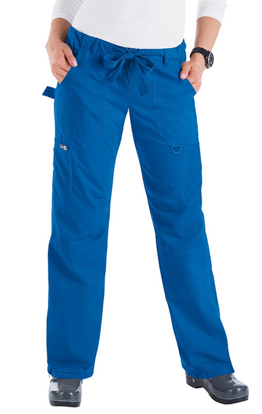 Koi has put a new twist on an old favorite! The koi Scrubs Lindsey low-rise cargo pant sits just below the waist and features an elasticized drawstring waistband. The boot cut leg also has an inside drawcord at the bottom of the hem for a customizable fit. There are two front pockets, two large cargo pockets and two back flap pockets providing ample storage. Both top stitch detail and fashion key loops are added touches of details that make these pants a must have for your scrub collection.