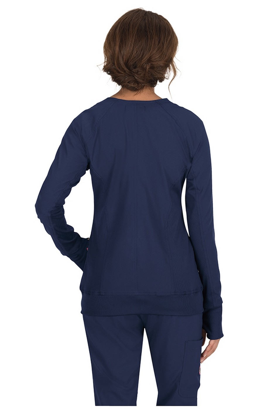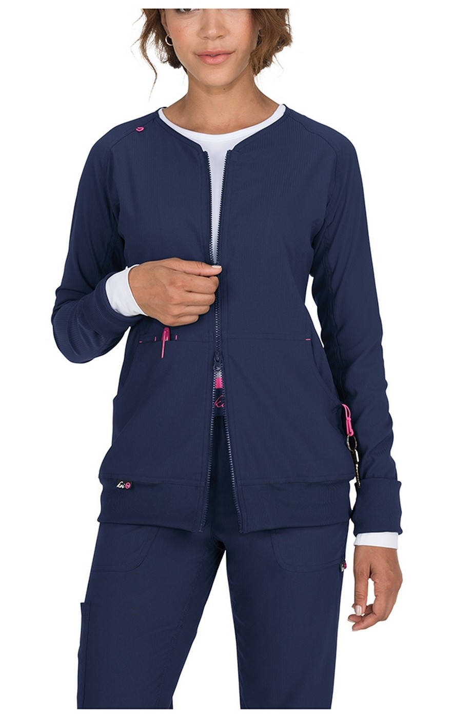 The Clarity two-way zip front scrub jacket from Koi Lite is constructed of polyester dobby stretch fabric for just the right amount of stretch and warmth. Thumbhole sleeves and rib knit cuffs and hem provide extra coziness. Two curved front pockets, plus contrast bungee loop, cord and clip provide places to store and secure your essentials.