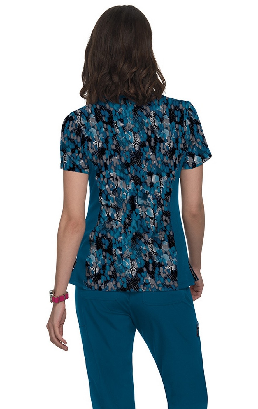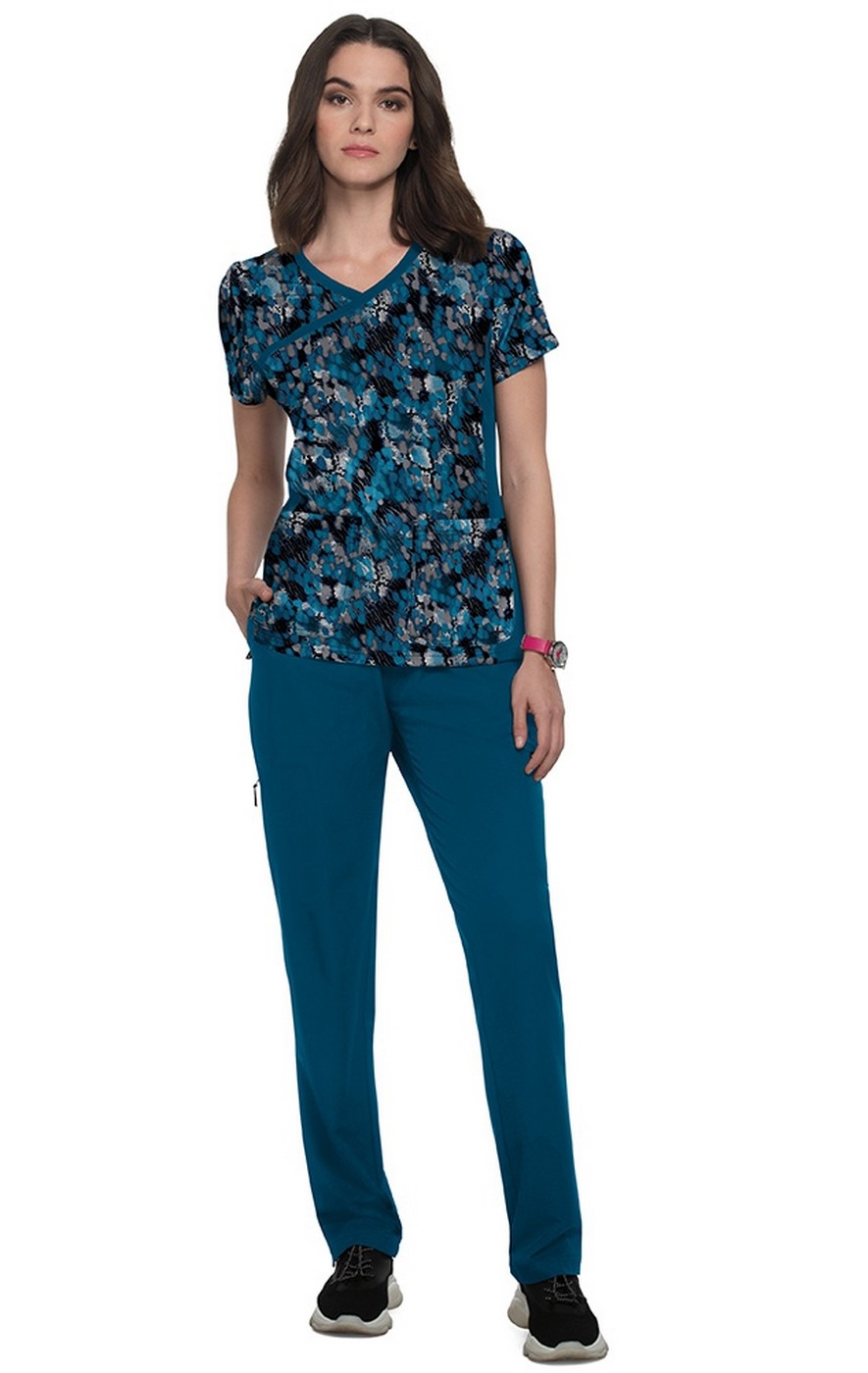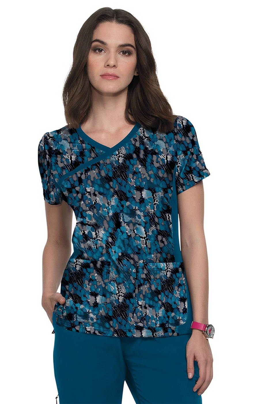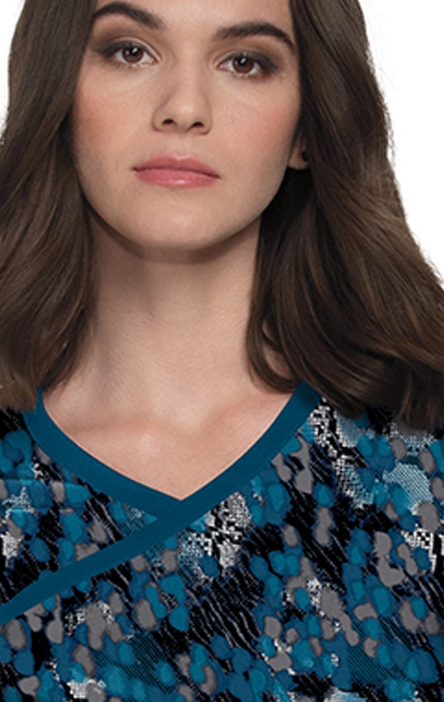 Stunning print top with mock-wrap neck and 4-way stretch. Contemporary fit.