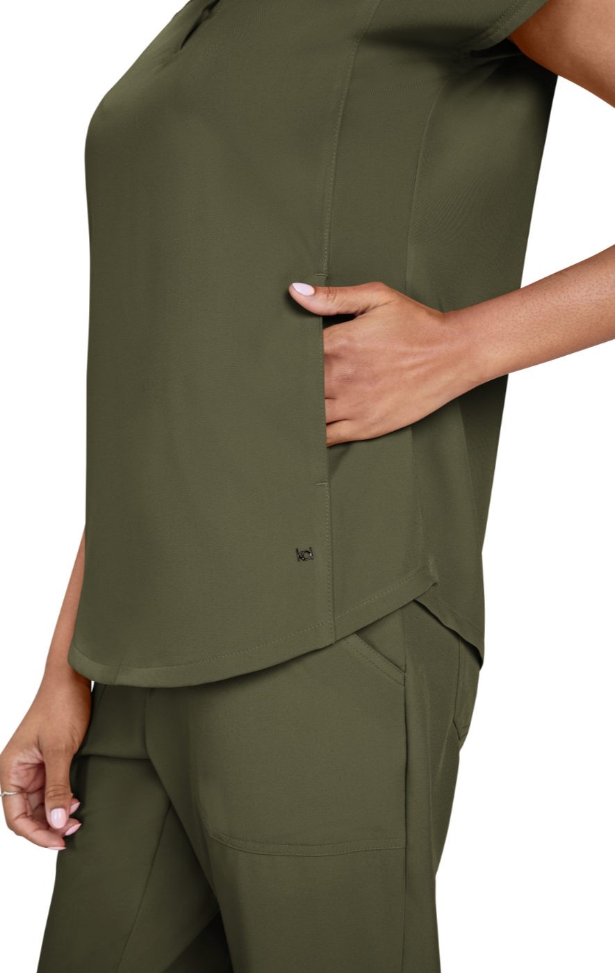 Take on the day with this sleek, modern women's scrub top designed to power you through even the busiest shifts. Featuring a high neck collar with a hidden button closure, dolman cap sleeves, ID badge loop ,and 2 front inseam pockets to keep your essentials close at hand. Made with our signature koi Next Gen 4-way stretch fabric, it features a soft brushed finish and advanced moisture-wicking that keeps you cool, calm, and collected even under pressure.