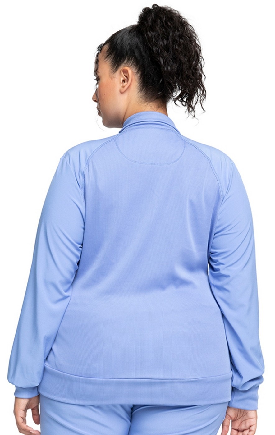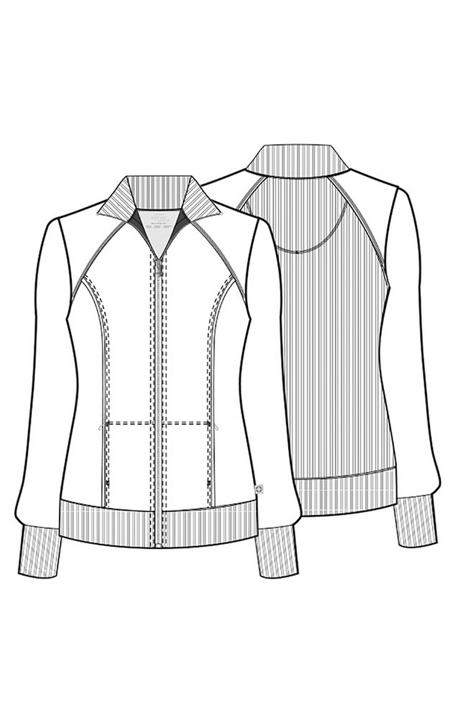 A Contemporary fit, sporty zip front jacket features front and back shoulder yokes, front princess seams with flat piping, hidden pockets with a zipper closure and a logo zipper pull. The back panel, collar, cuffs and waistband are made in a stretch rib knit for extra comfort—cover-stitch detail throughout. Center back length: 26". The comfortable stretch poplin fabric and super stretchy rib knit are the perfect combos for healthcare professionals.