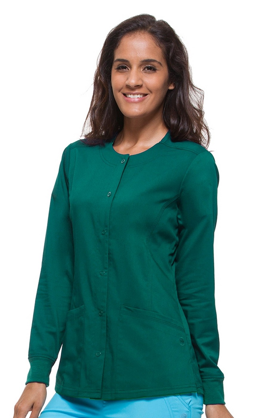 This women’s crew neck features a snap closure and large patch pockets in the front, as well as a handy cell phone pocket. Side slits and soft knit cuffs complete the look.