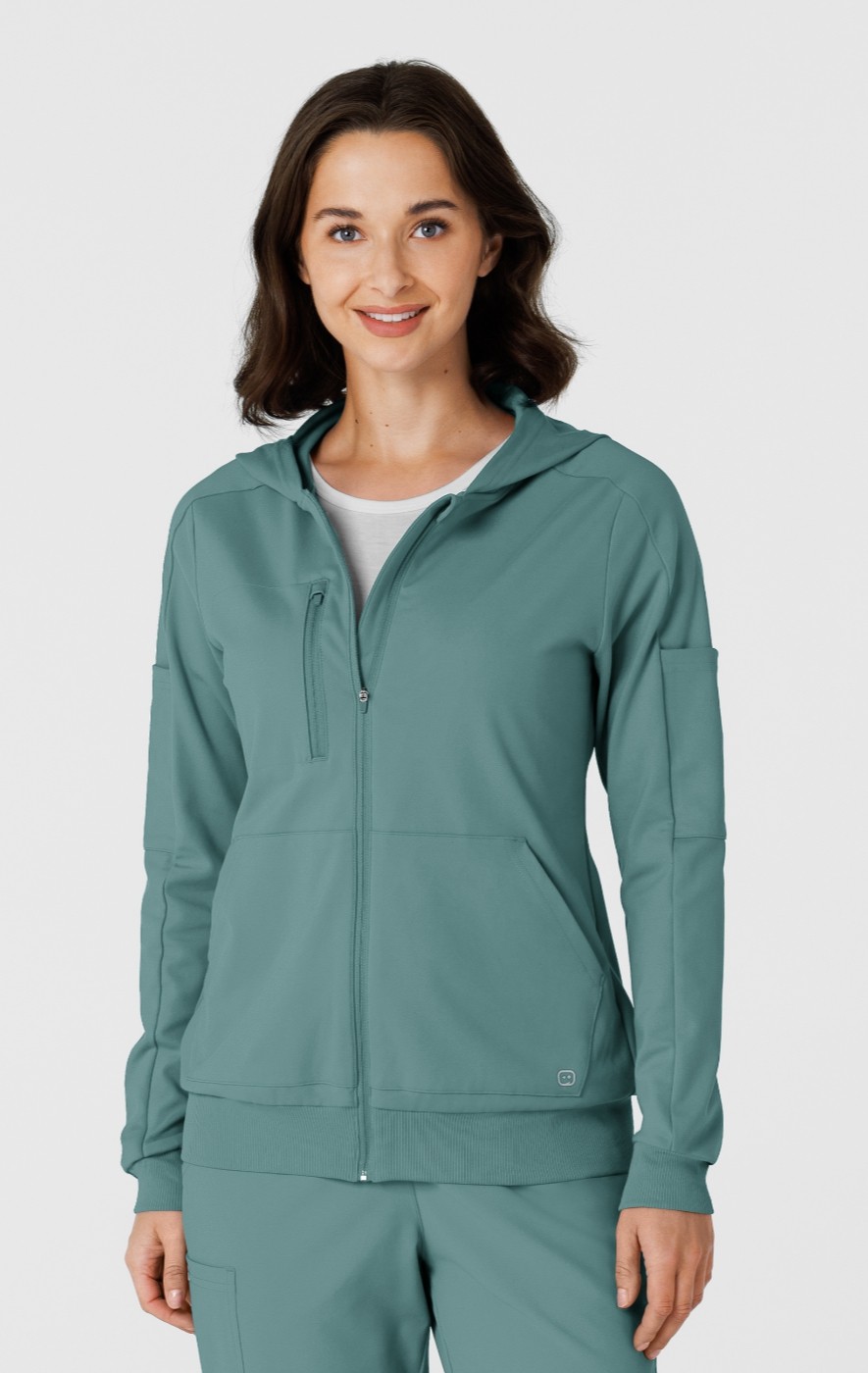 Stay cozy and effortlessly on-the-go with the RENEW Knit Women's Zip Hoodie. Designed for healthcare professionals, this versatile hoodie is perfect for layering over scrubs. It’s part of the eco-friendly RENEW collection, crafted from a soft, sustainable polyester-spandex blend that stretches with your every move. With practical features like a zip chest pocket, roomy kangaroo pockets, and an extra sleeve pocket, it keeps your essentials close at hand. Rib-knit cuffs add a touch of ease, allowing quick glove changes, while a shoulder badge loop keeps your ID in view. From bustling hallways to quiet nurse’s stations, this hoodie has you covered in both style and functionality.