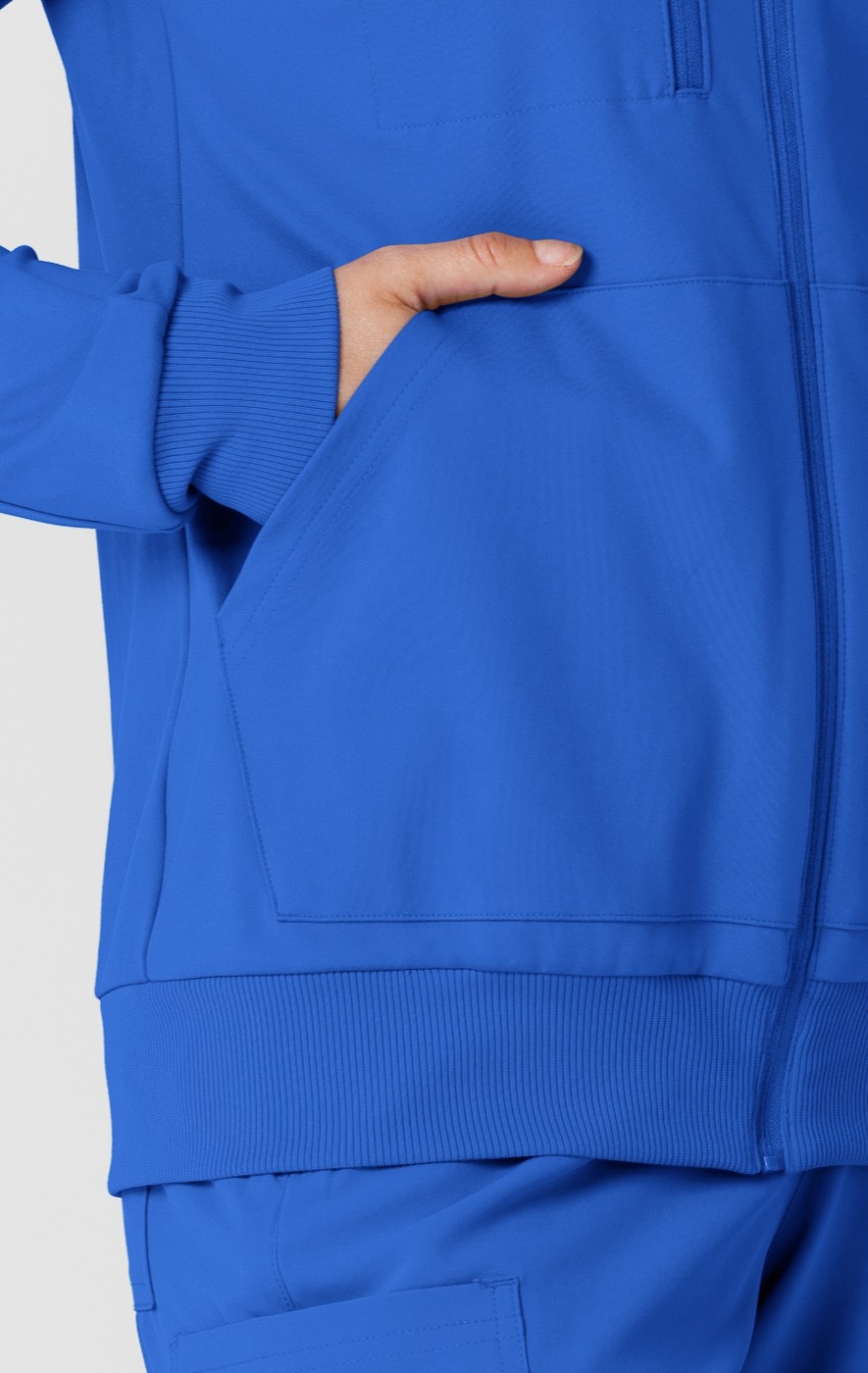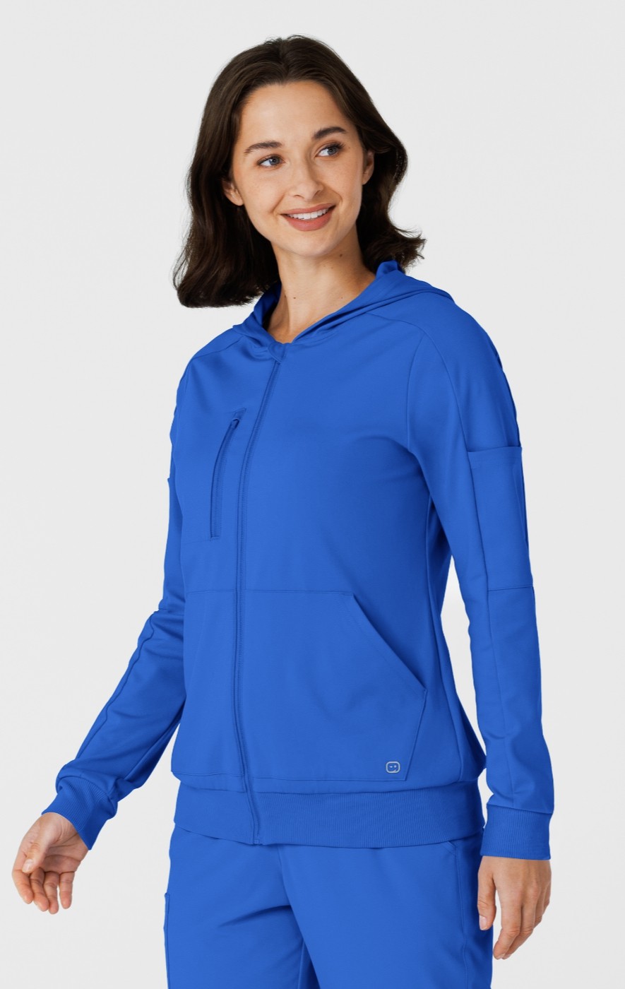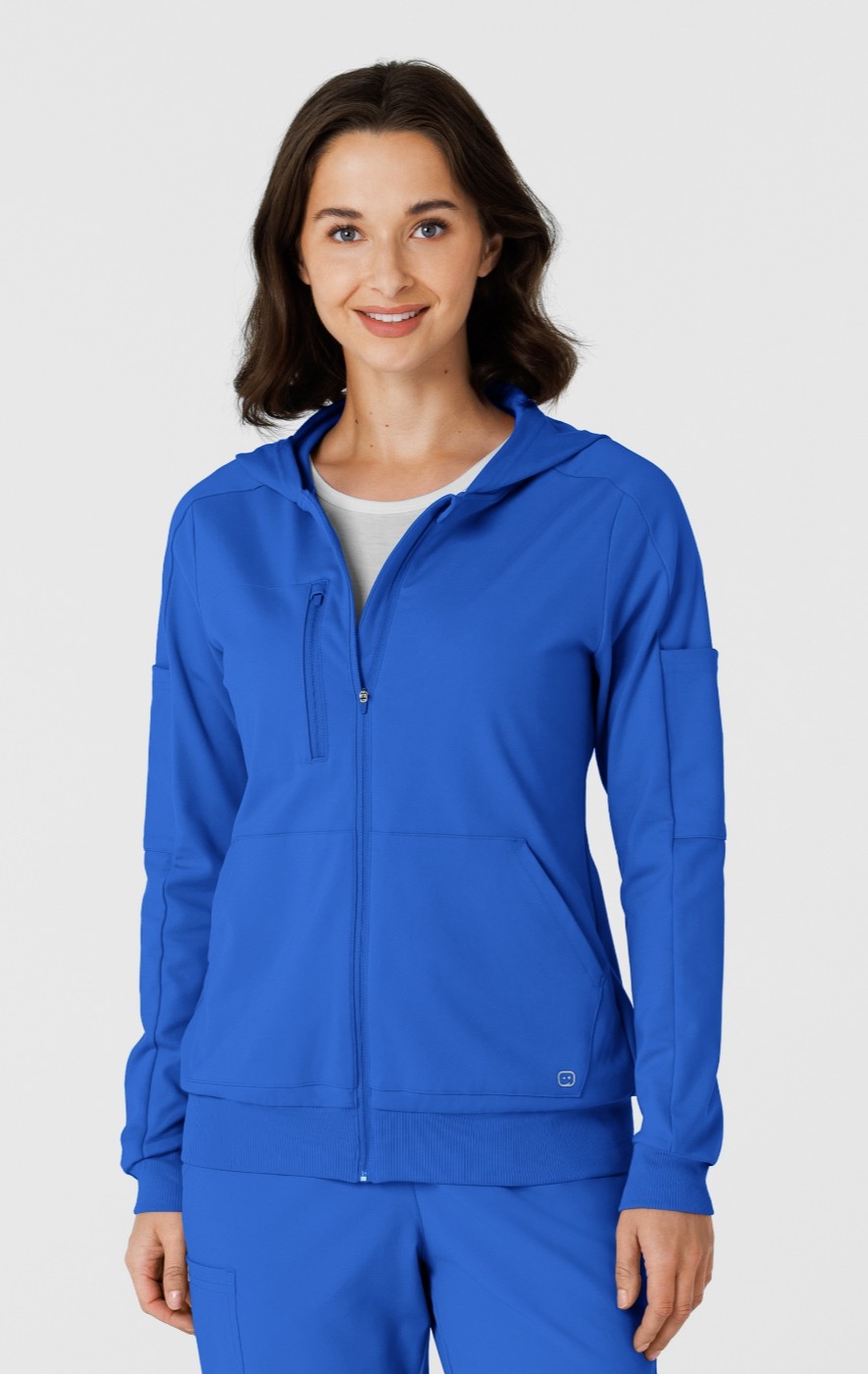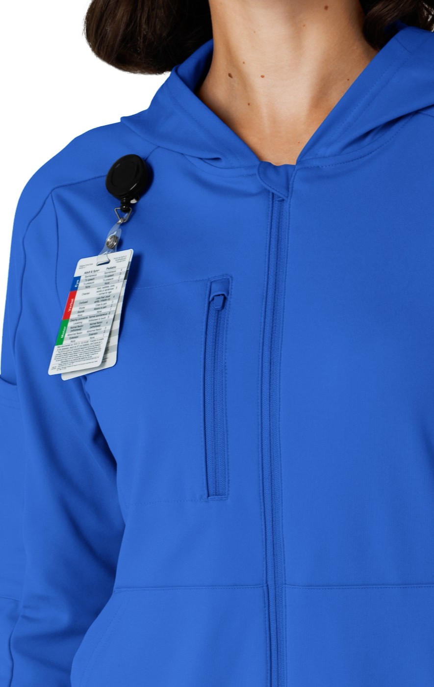 Stay cozy and effortlessly on-the-go with the RENEW Knit Women's Zip Hoodie. Designed for healthcare professionals, this versatile hoodie is perfect for layering over scrubs. It’s part of the eco-friendly RENEW collection, crafted from a soft, sustainable polyester-spandex blend that stretches with your every move. With practical features like a zip chest pocket, roomy kangaroo pockets, and an extra sleeve pocket, it keeps your essentials close at hand. Rib-knit cuffs add a touch of ease, allowing quick glove changes, while a shoulder badge loop keeps your ID in view. From bustling hallways to quiet nurse’s stations, this hoodie has you covered in both style and functionality.