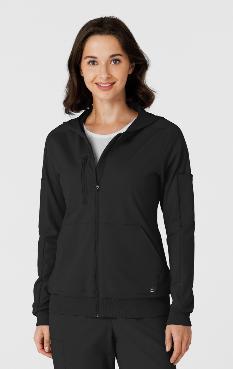Stay cozy and effortlessly on-the-go with the RENEW Knit Women's Zip Hoodie. Designed for healthcare professionals, this versatile hoodie is perfect for layering over scrubs. It’s part of the eco-friendly RENEW collection, crafted from a soft, sustainable polyester-spandex blend that stretches with your every move. With practical features like a zip chest pocket, roomy kangaroo pockets, and an extra sleeve pocket, it keeps your essentials close at hand. Rib-knit cuffs add a touch of ease, allowing quick glove changes, while a shoulder badge loop keeps your ID in view. From bustling hallways to quiet nurse’s stations, this hoodie has you covered in both style and functionality.