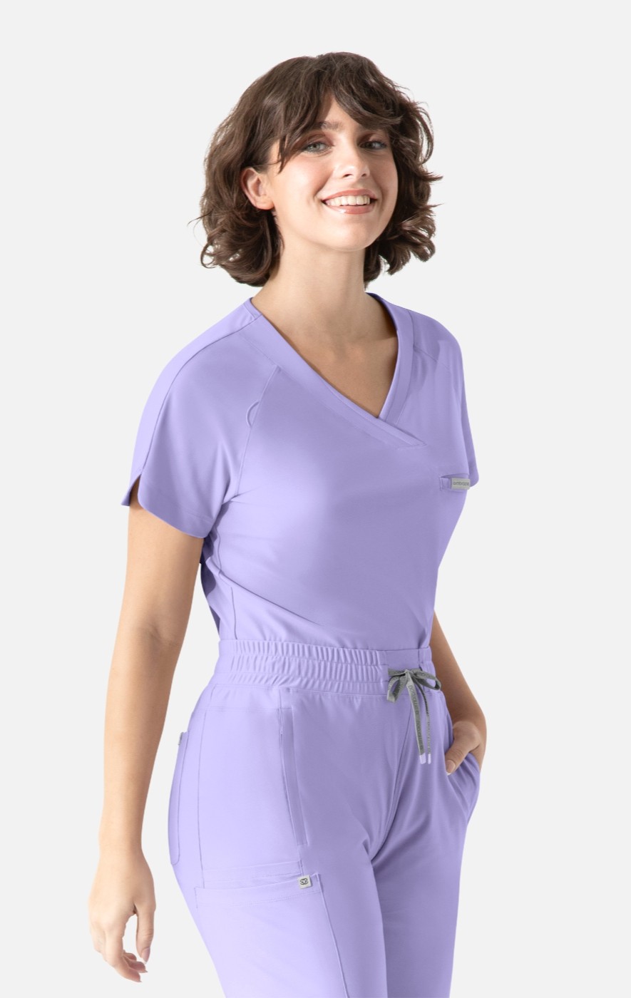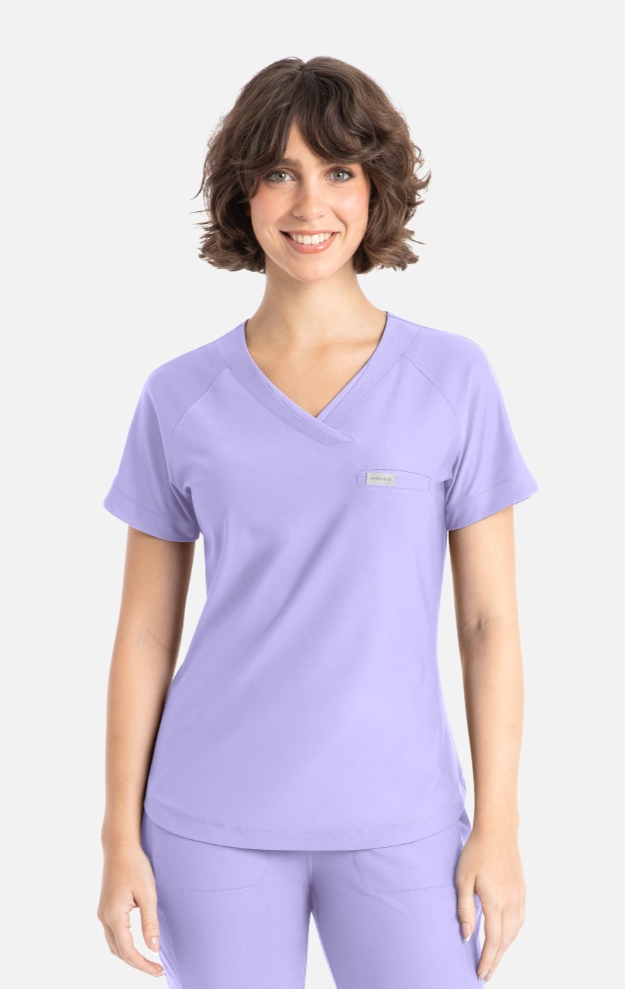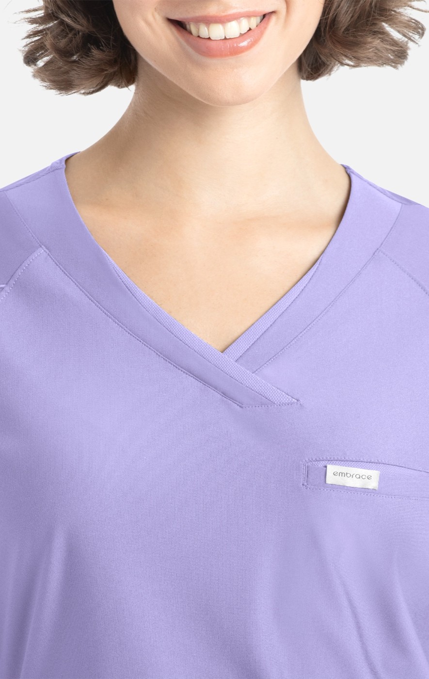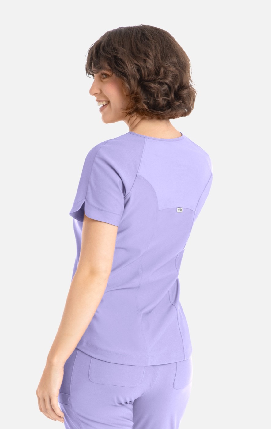 Stylized as an asymmetrical neckline and integrated with self and mesh panels, the Luna top defines the ideal slim fit uniform top with distinctive refinement.