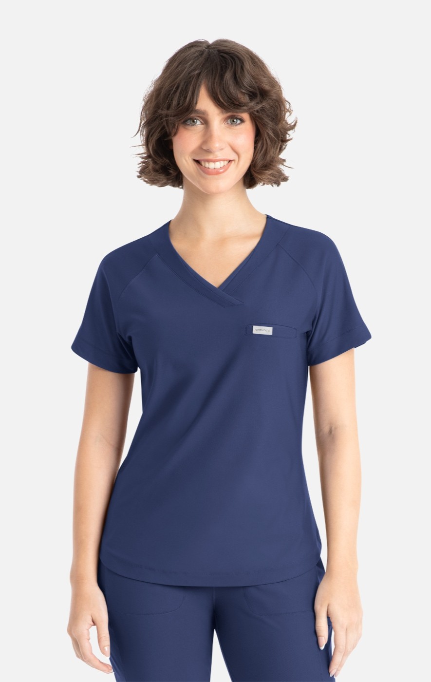 Stylized as an asymmetrical neckline and integrated with self and mesh panels, the Luna top defines the ideal slim fit uniform top with distinctive refinement.