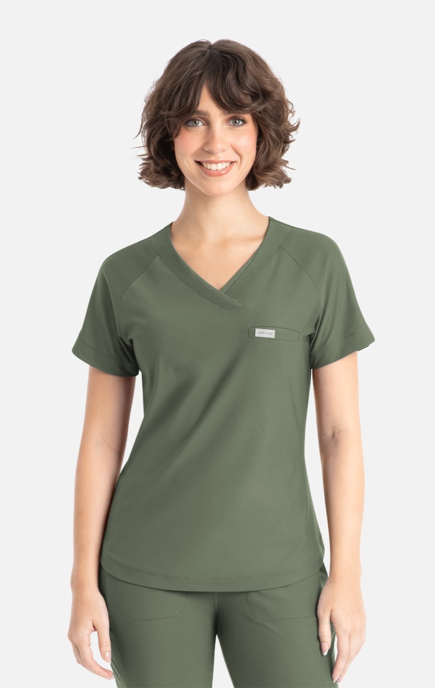 Stylized as an asymmetrical neckline and integrated with self and mesh panels, the Luna top defines the ideal slim fit uniform top with distinctive refinement.