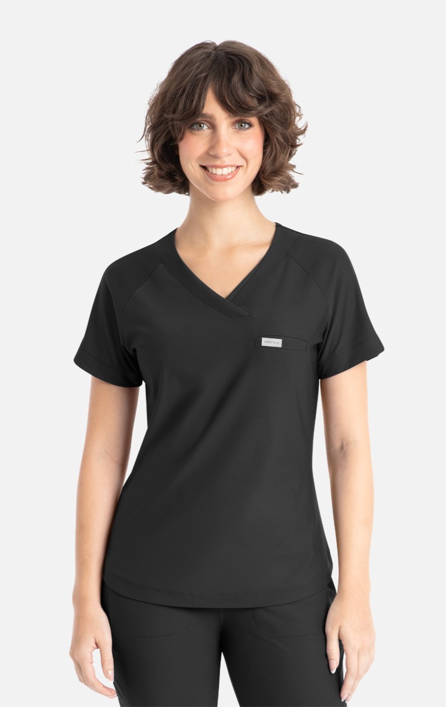 Stylized as an asymmetrical neckline and integrated with self and mesh panels, the Luna top defines the ideal slim fit uniform top with distinctive refinement.