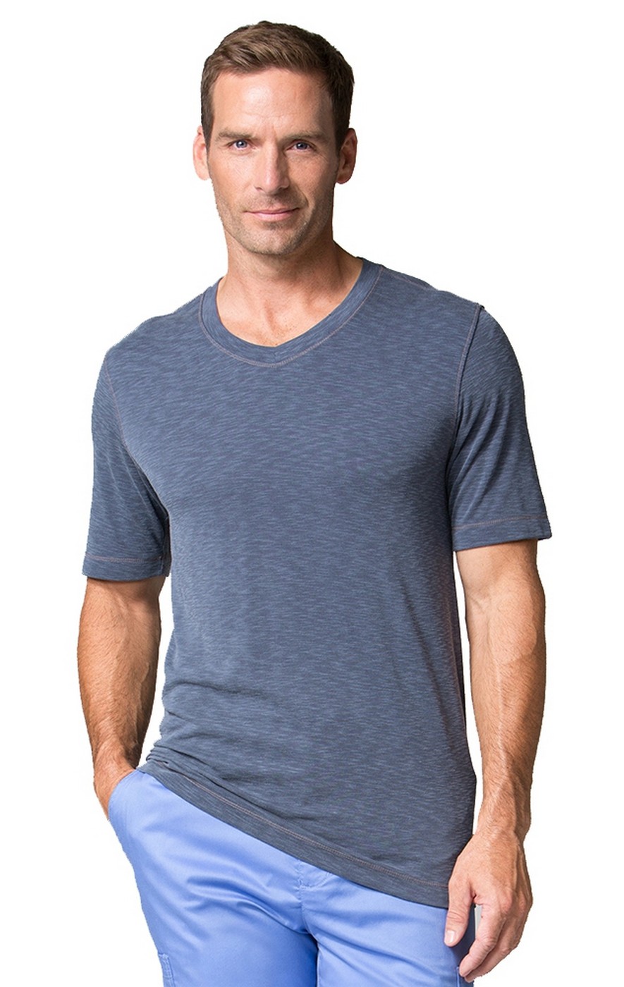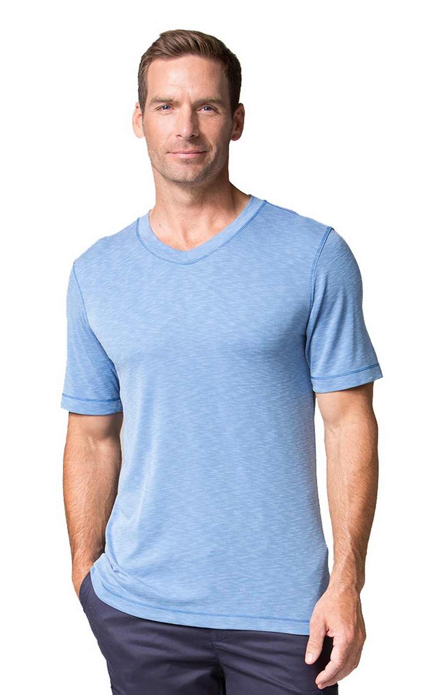 Maevn men's curved V-neck. Subtle contrast flatlock stitching throughout tee. Luxurious soft slub modal. Excellent durability with no piling after repeated washes. SIZES: XS - 3XL. LENGTH: 29.5". FABRIC: 78% Modal 22% Polyester.