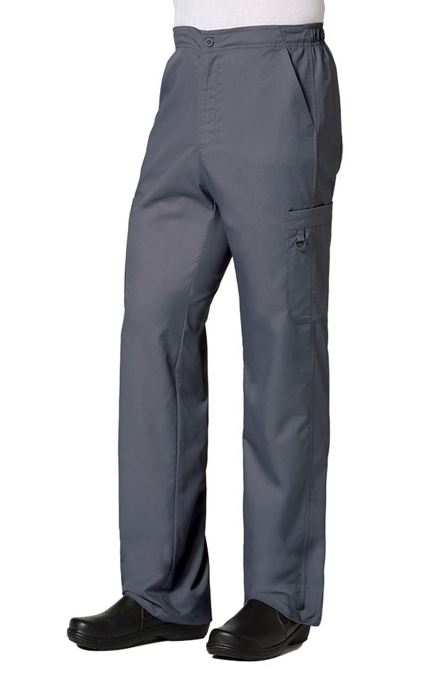 The Maevn EON 8308 men's cargo scrub pant sits at the waist and features a drawstring, elastic back, and functional zipper fly. For maximum storage, there are 8 pockets total: 2 front slant pockets, 2 cargo pockets, 1 mesh pocket, and 2 back pockets. In addition, you will find 1 pen slot with a triangle ring.