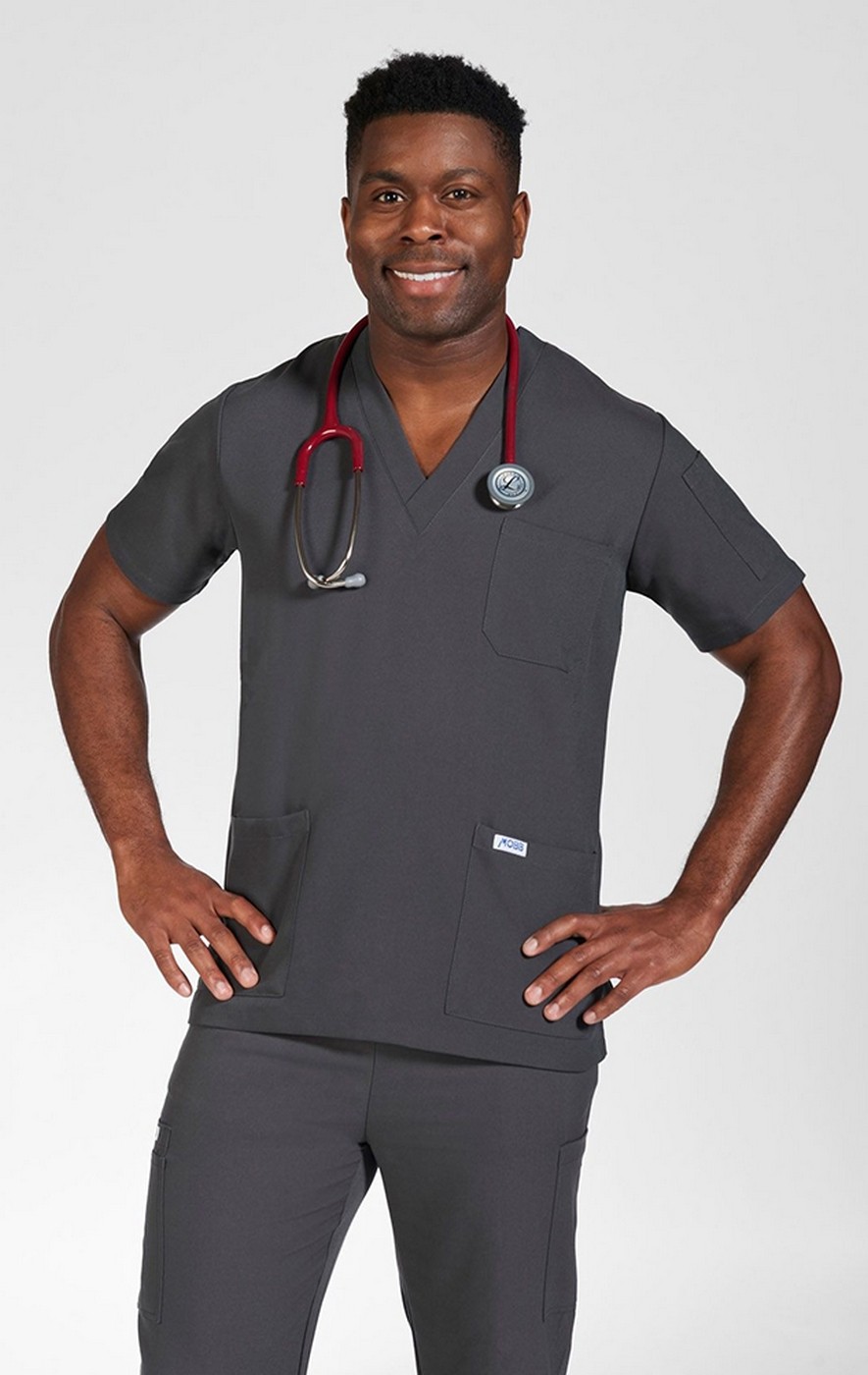 Classic style meets utmost comfort! This Unisex V-neck top features one chest pocket, two lower patch pockets and a shoulder pen pocket.