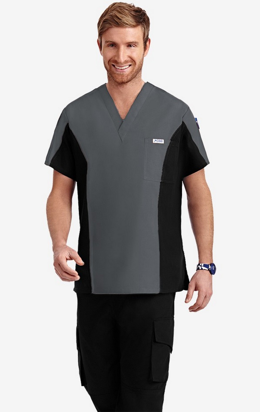 Available in four color-ways this scrub top is becoming a favorite among men in the medical field. This two-tone scrub top has one chest pocket and one shoulder pen pocket. This top mates perfectly with all MOBB pants. Available in sizes XS to 3XL. Fabric is poly/cotton 65/35.