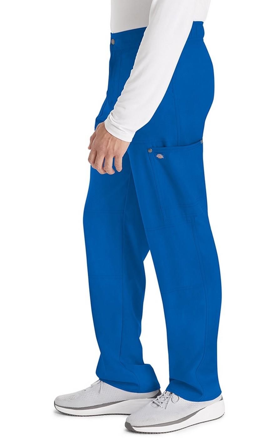 This Men's fit mid rise pant has an elastic-reinforced waistband with inside logo drawstring for adjustability and security. Pull-on waist with zip fly and logo snap closure. There are four pockets for easy storage: two front slant pockets and two cargo pockets with decorative stitching (right with pen/instrument stitch). Cargo pockets have decorative logo snaps at corners. Decorative knee stitching and decorative stitching on all seams for added styling. Logo locker loop at center back waist for quick hanging.