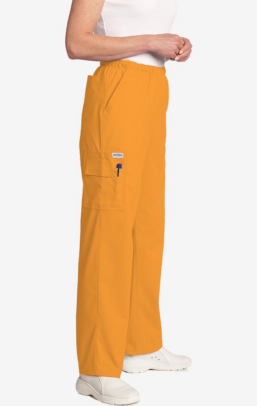 This MOBB unisex style is made to fit everyone looking for a sensible scrub pant. Features a combination drawstring and elastic waistband and a slimming cut ankle. The two slash pockets located at the top of MOBB's bestselling scrub pant complement the two lower side cargo pockets. The left cargo pocket divides and conquers all, including a secure Velcro flap compartment and pen/scissor pockets. One back pocket. Length is 32". Fabric is poly/cotton 65/35. Sizing XXS to 5XL. Matches all MOBB top colors. Size 5XL available only in Black and Navy.