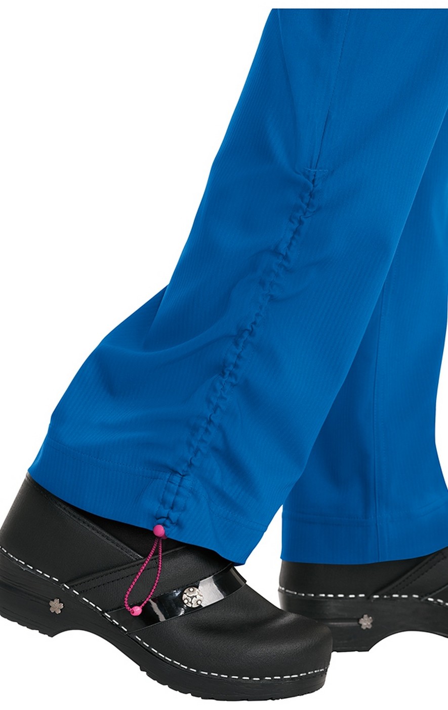 Koi Lite™ Scrubs 720 Spirit Elastic Waist Slim Fit Pant is a mid-rise, straight leg pant. This scrub pant features an adjustable bungee cord at the hem with an inside button to secure cord. Double elastic waistband with Koi logo the bottom band add style to this scrub pant. There's also a contrasting hidden keychain bungee with clip on the left front pocket. These pants are truly a storage lover's dream with two large front pockets, a cargo pocket with a Koi patch logo on the right leg and two back pockets. Moisture wicking and wrinkle free performance stretch fabric is 100% polyester dobby stretch. Rib trim: 92/8 poly/spandex. The approximate inseam for size M is 31.5".