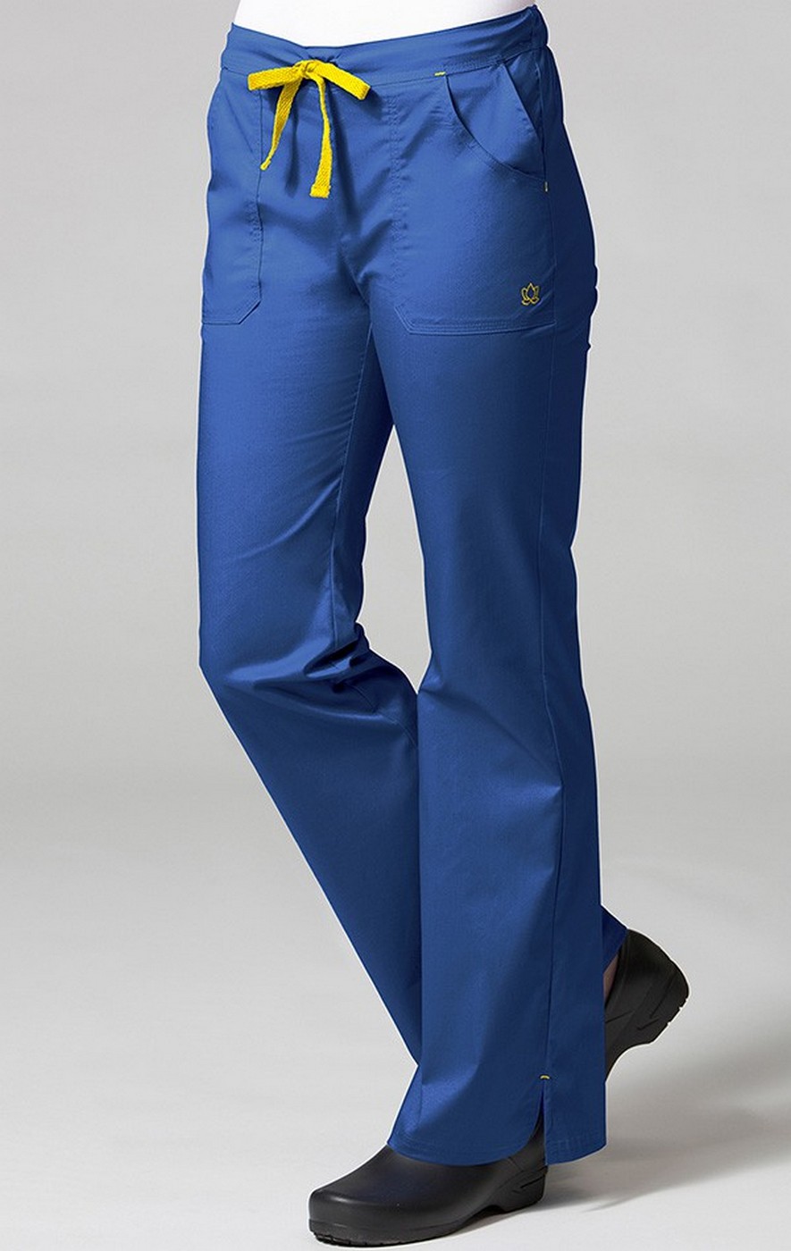 Designed with our signature stretch fabric that is soft to the touch, yet crisp and professional. Fashion flare pant with back elastic waist. Triple stitching at waist and pockets. Four front slash pockets and one back pocket. High quality contrast colored twill tape drawstring. Contrast bartacks at all pressure point. Vented hems for added mobility. SIZES: XS - 2XL. INSEAM: Reg: 31" Petite: 28". FABRIC: 52% Cotton 45% Polyester 3% Spandex.