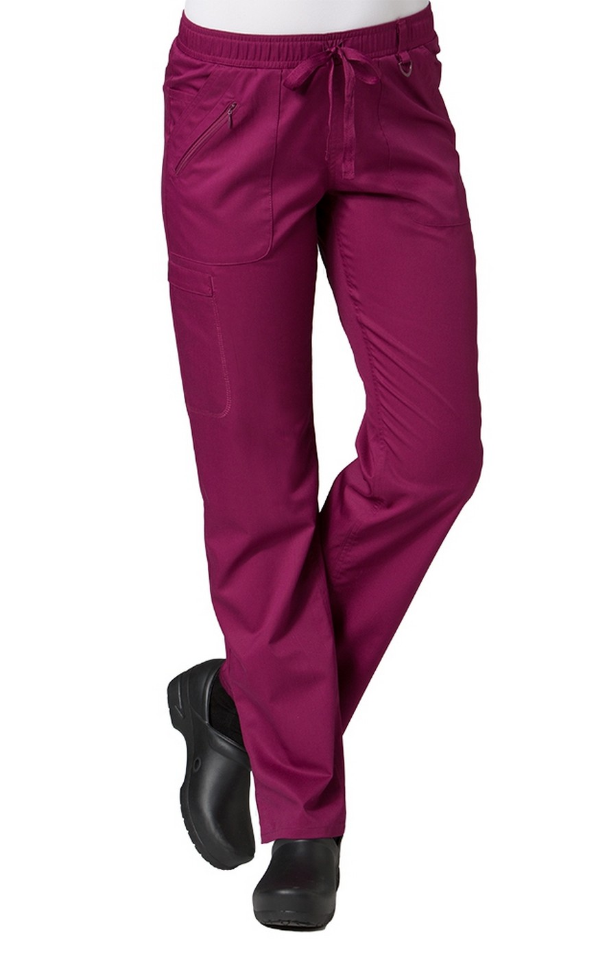 The Maevn EON 7308 cargo scrub pant features a full elastic waistband with a dyed-to-match drawstring. The straight legs and side vents allow extra comfort throughout your shift. For optimal storage, there are 6 pockets total: 2 front slant pockets, 1 interior cell phone pocket and zipper, 1 welt cargo pocket, and 2 back welt pockets. You will also find a triangle ring at the belt loop. Fabric is 59/22/19 polyester/rayon/elasterell-p. Approximate length for a size medium is 30.5".